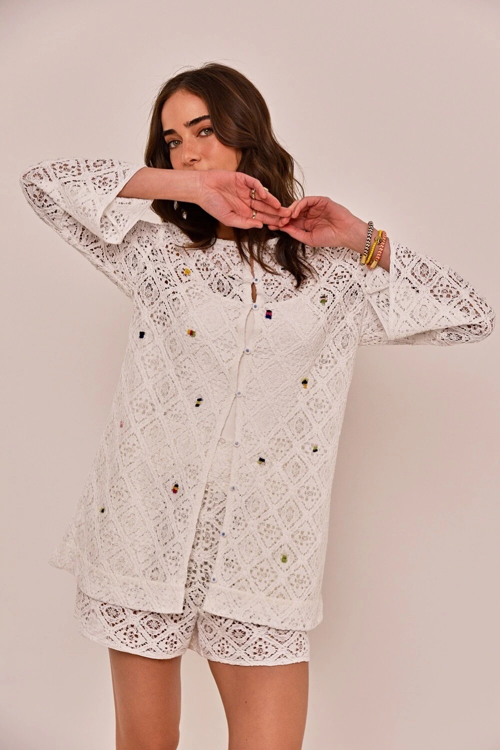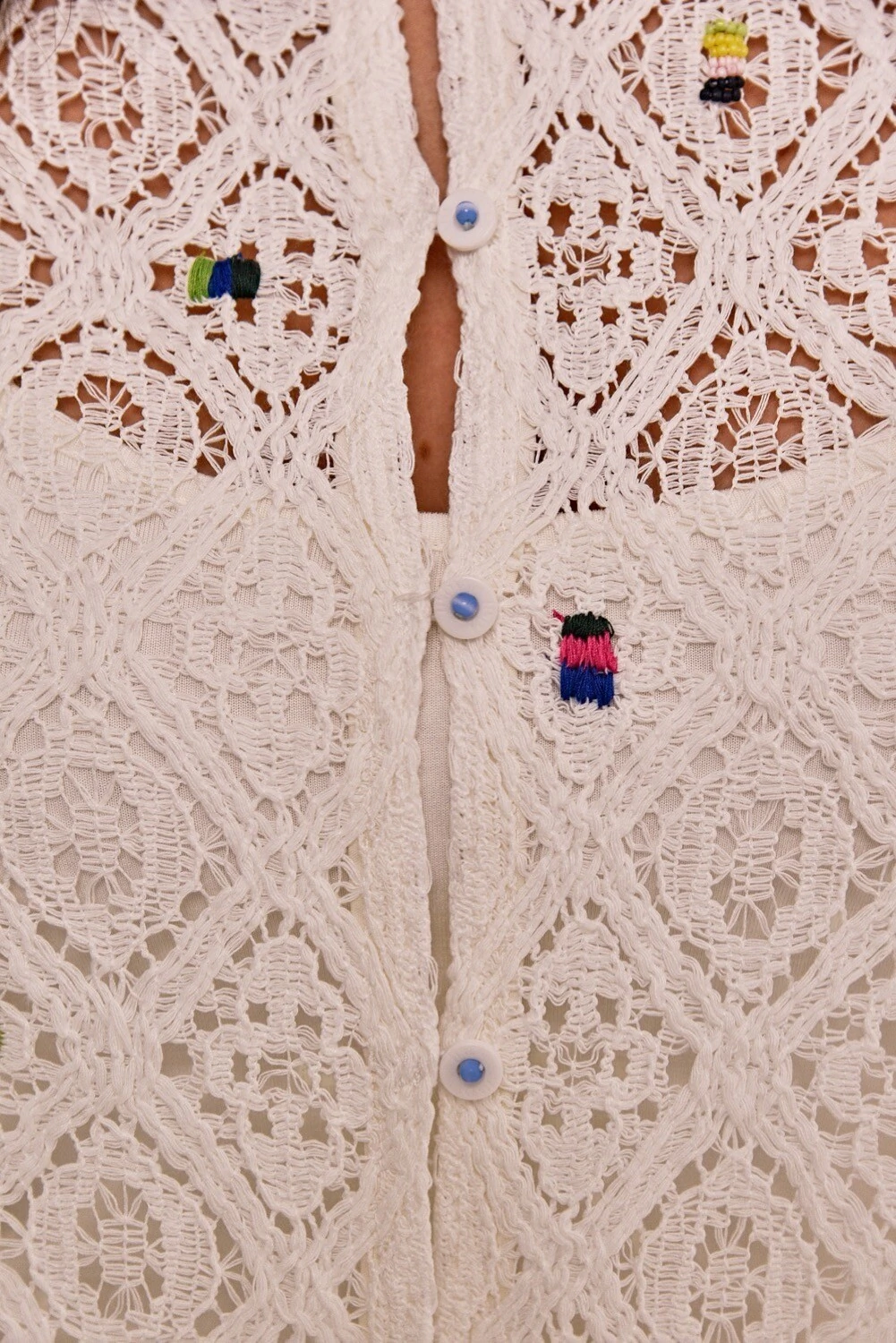 A blusa Sunrise é feita em tela com padronagem geométrica e aplicação de bordados, disponível na cor off-white. Possui modelagem reta, decote redondo, manga longa com modelagem ampla, vista de botões, comprimento alongado e transparência.