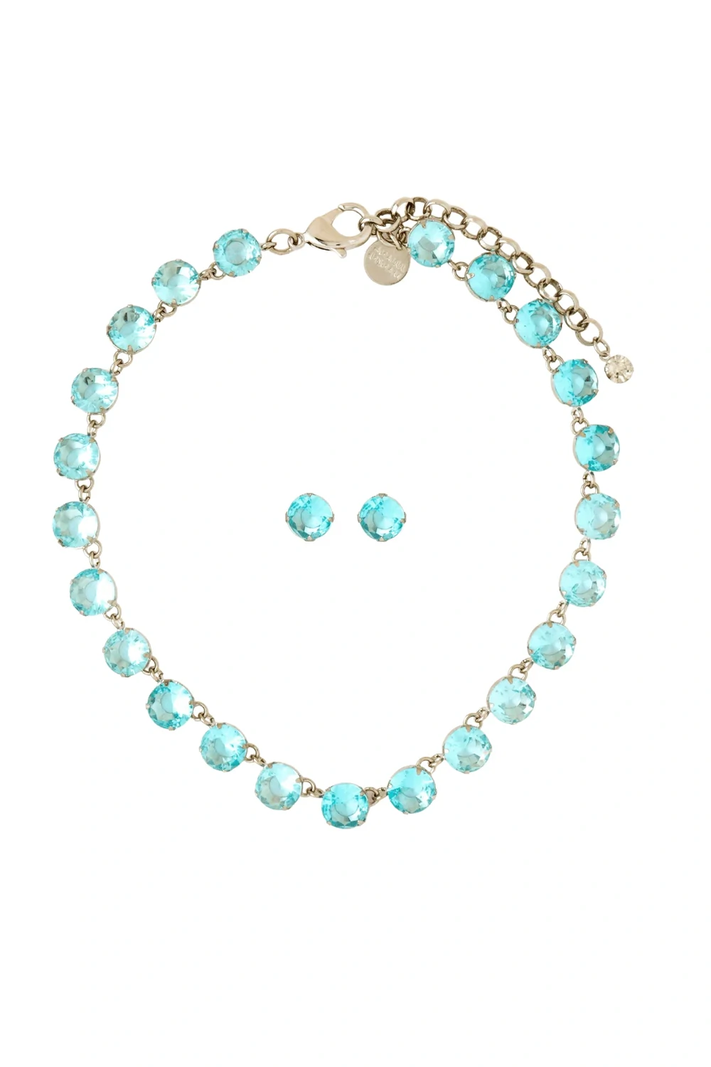 Kit colar e brinco de pino e tarraxa, fabricados em metal com banho prateado e pedras de cristal azul.