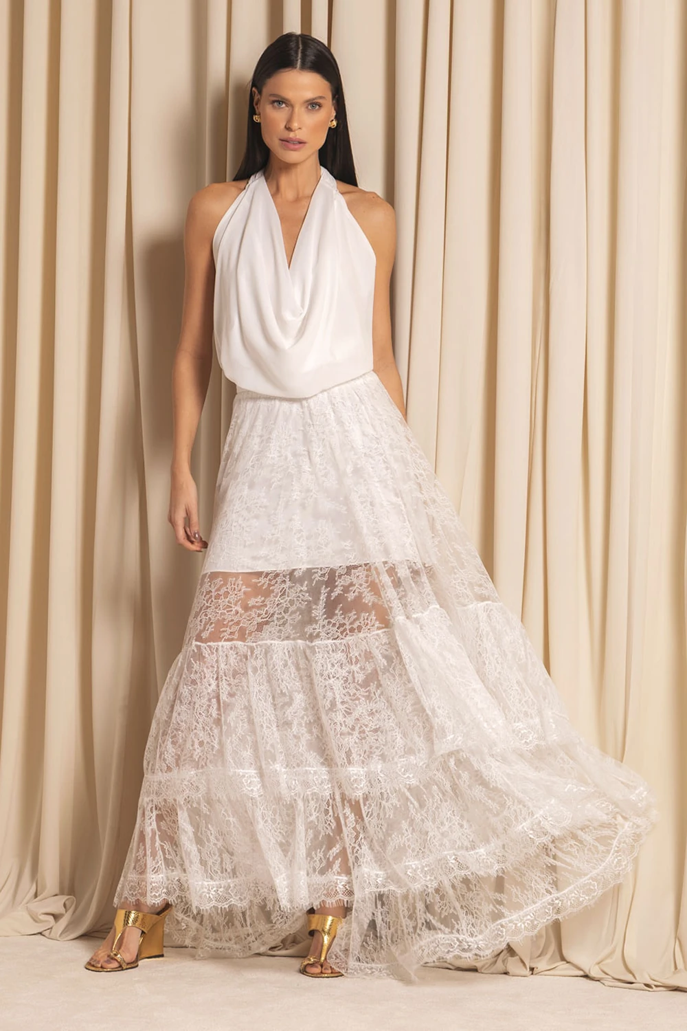 Saia longa confeccionada em renda. Peça modelada com cintura alta e elástico embutido na parte posterior do cós. Acompanha forro removível curto. Todos os aviamentos da peça foram exclusivamente desenvolvidos e personalizados Dress & Co.