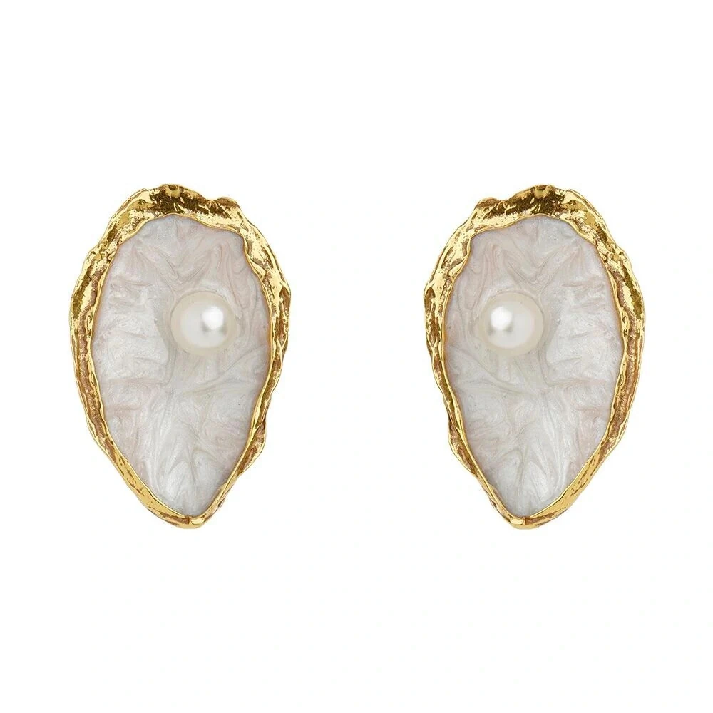 Brinco de pressão em metal no banho ouro vintage, com ostra em esmaltação perolada com 1 pérola 10mm.