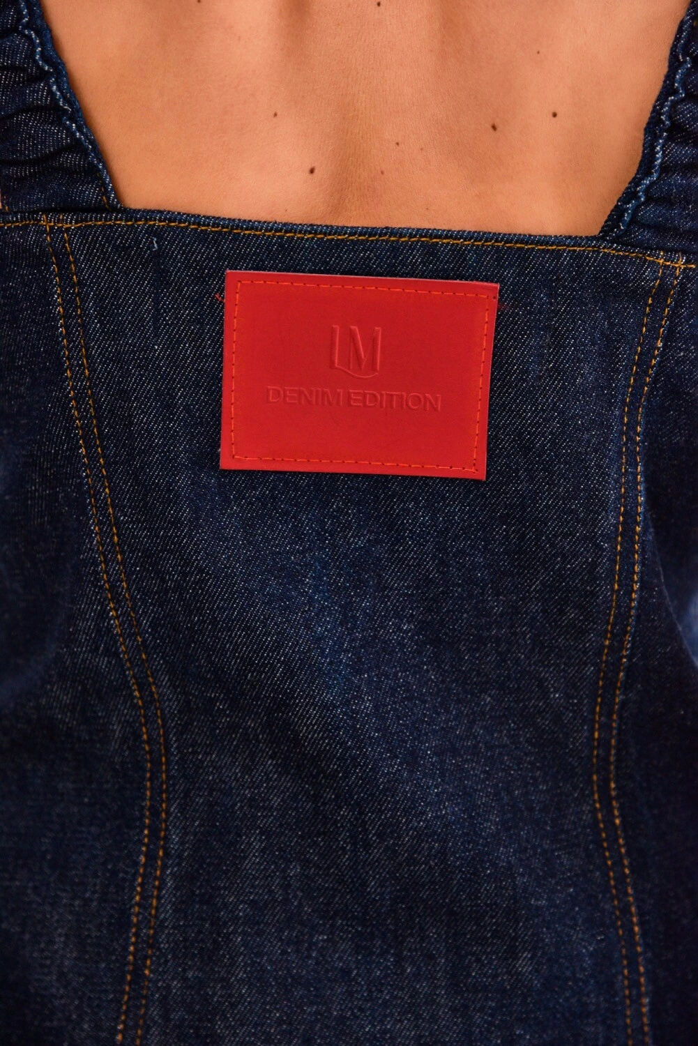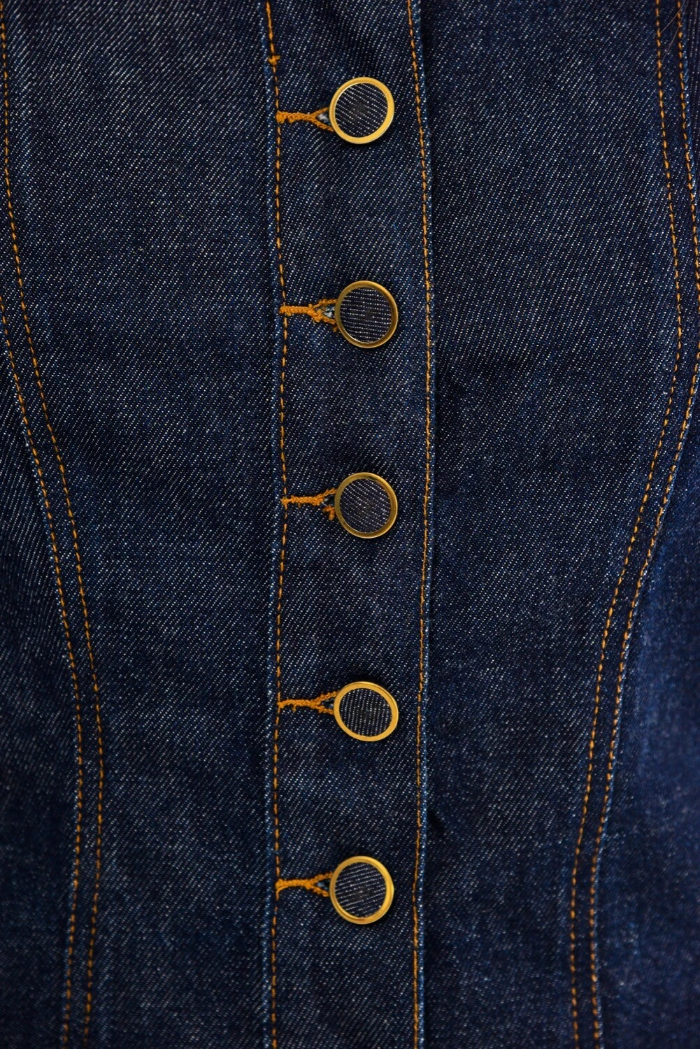 A blusa Alba é feita em jeans de lavagem escura. Possui modelagem slim, acinturada, regata, decote reto, vista de botões e acabamento simples. Jeans com a lavagem escura e detalhes de costura clássica em tom de contraste.