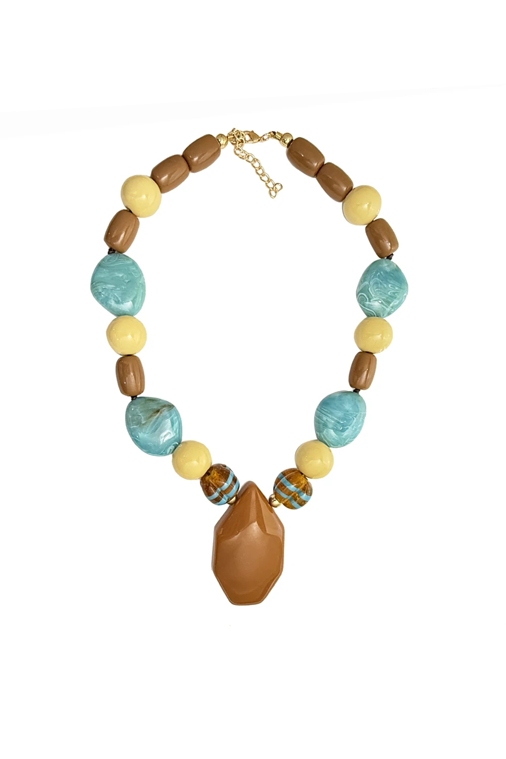 Colar curto em resina e muranos com pingente resina. Fechamento em corrente e fecho lagosta.