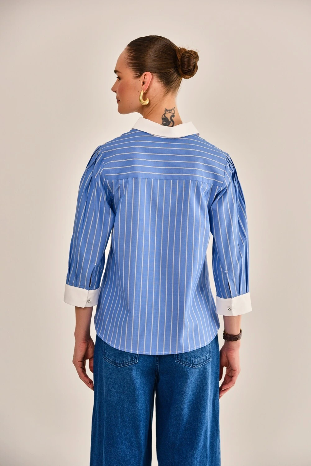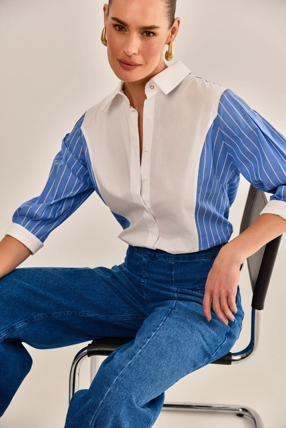 A camisa Vitória é feita em tricoline bicolor frente em tom off white e mangas e costas em azul com padronagem de risca vertical. A modelagem é levemente acinturada, possui gola clássica, fechamento frontal por botôes, mangas 7/8 levemente bufantes com punhos contrastantes que reforçam o acabamento de alfaiataria e adicionam equilíbrio visual ao design.