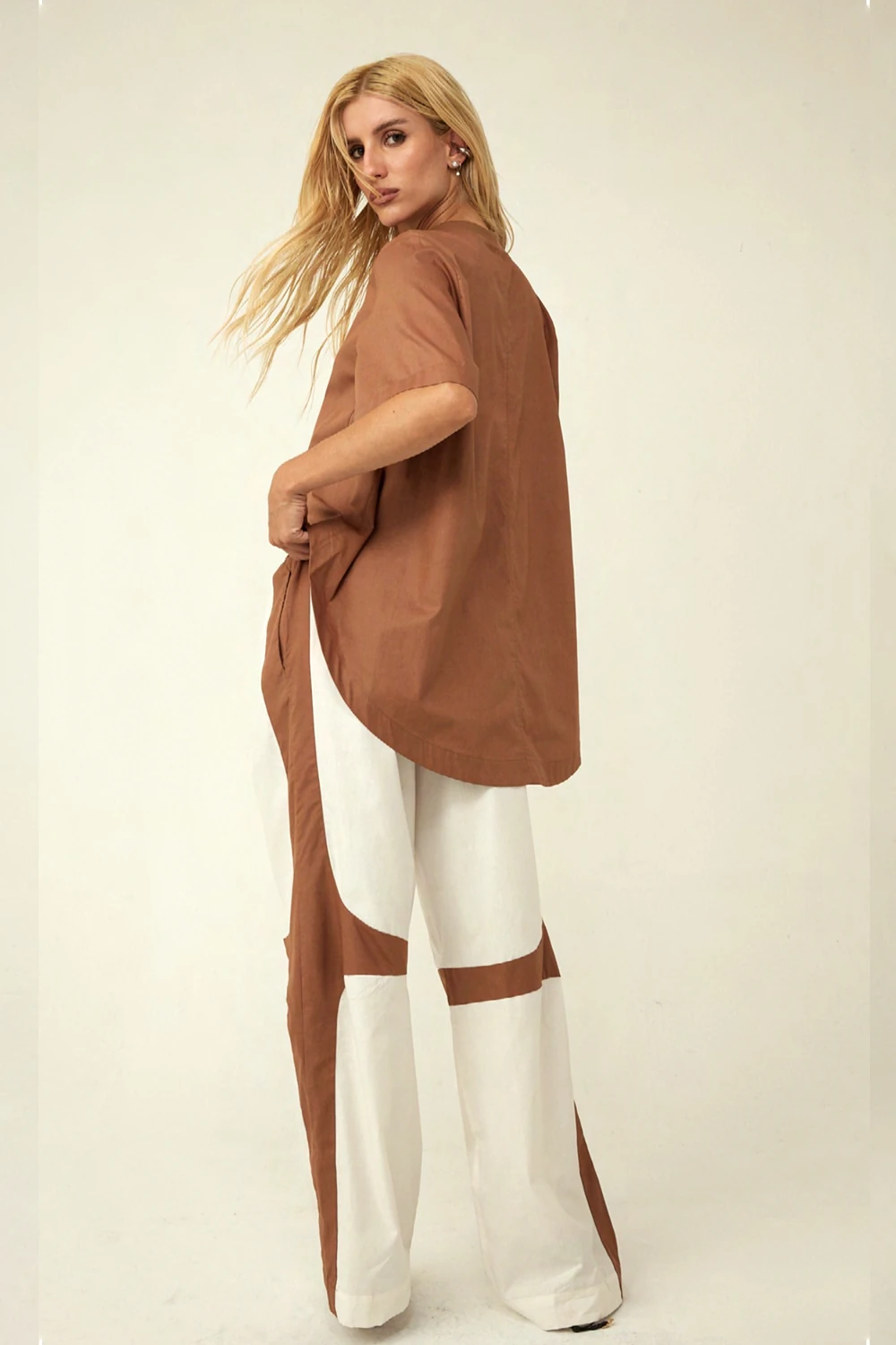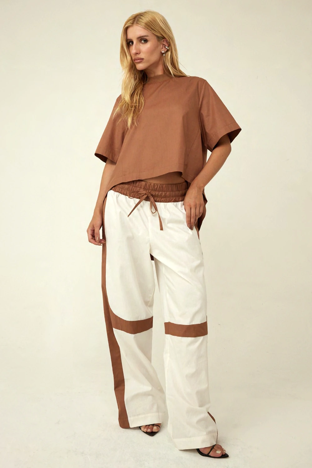 A Calça com contrastes dos tons terrosos traz personalidade e impacto visual. Confeccionada em algodão com modelagem reta e cós de elástico proporcinando conforto ao look.