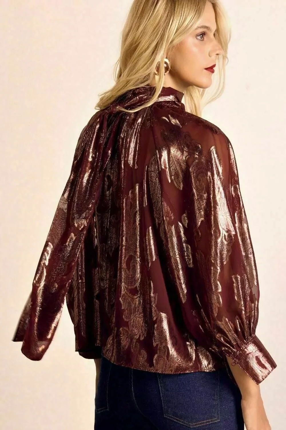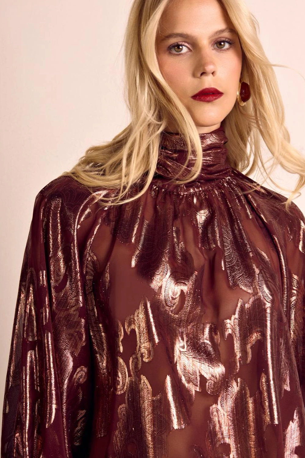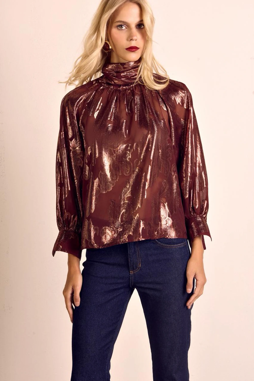 Camisa em chiffon jacquard com padronagem cashmere, leve brilho e transparência sutil. Possui gola alta versátil que pode ser usada com o laço ou lenço trazendo eleg6ancia e sofisticação ao look.