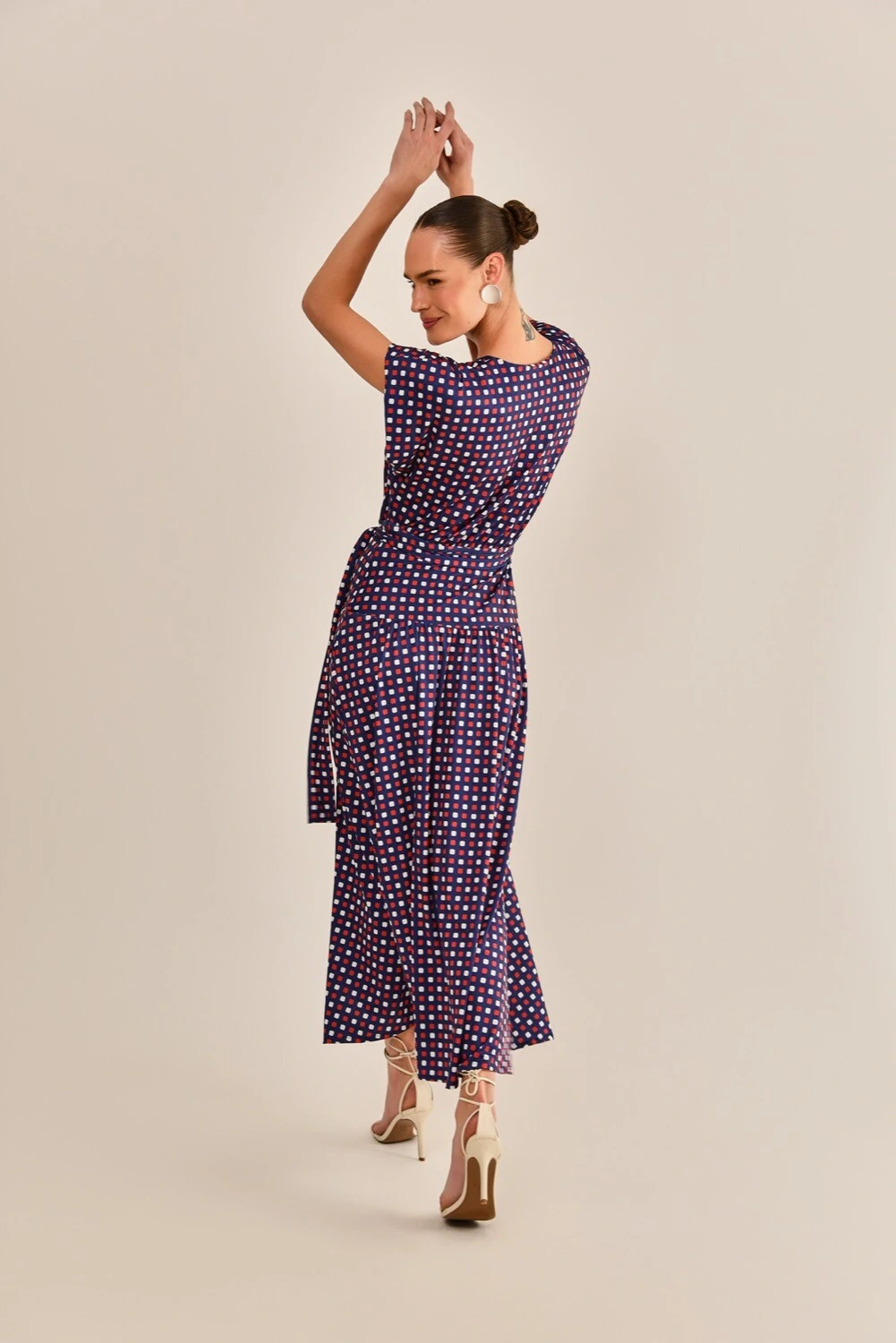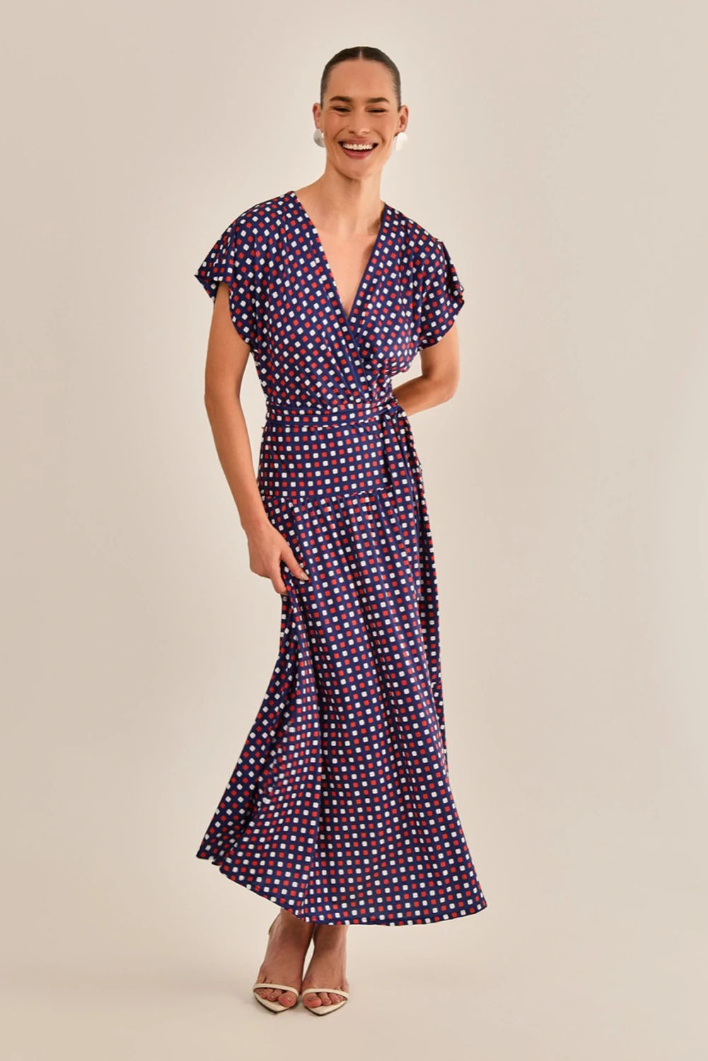 O vestido Alexia é feito em malha com estampa autoral de gravataria, disponível na cor azul marinho. Com modelagem evasê e comprimento longo, a peça une romantismo e delicadeza. Possui decote v, mangas curtas com caimento fluido e acabamento simples. Acompanha faixa em mesmo tecido e estampa.