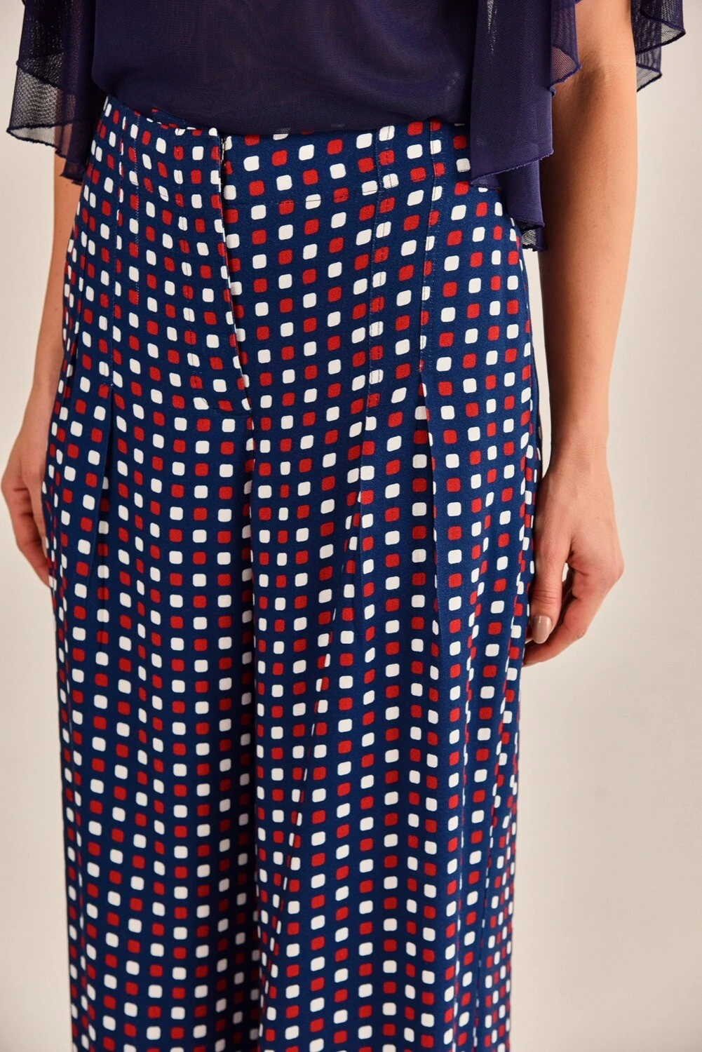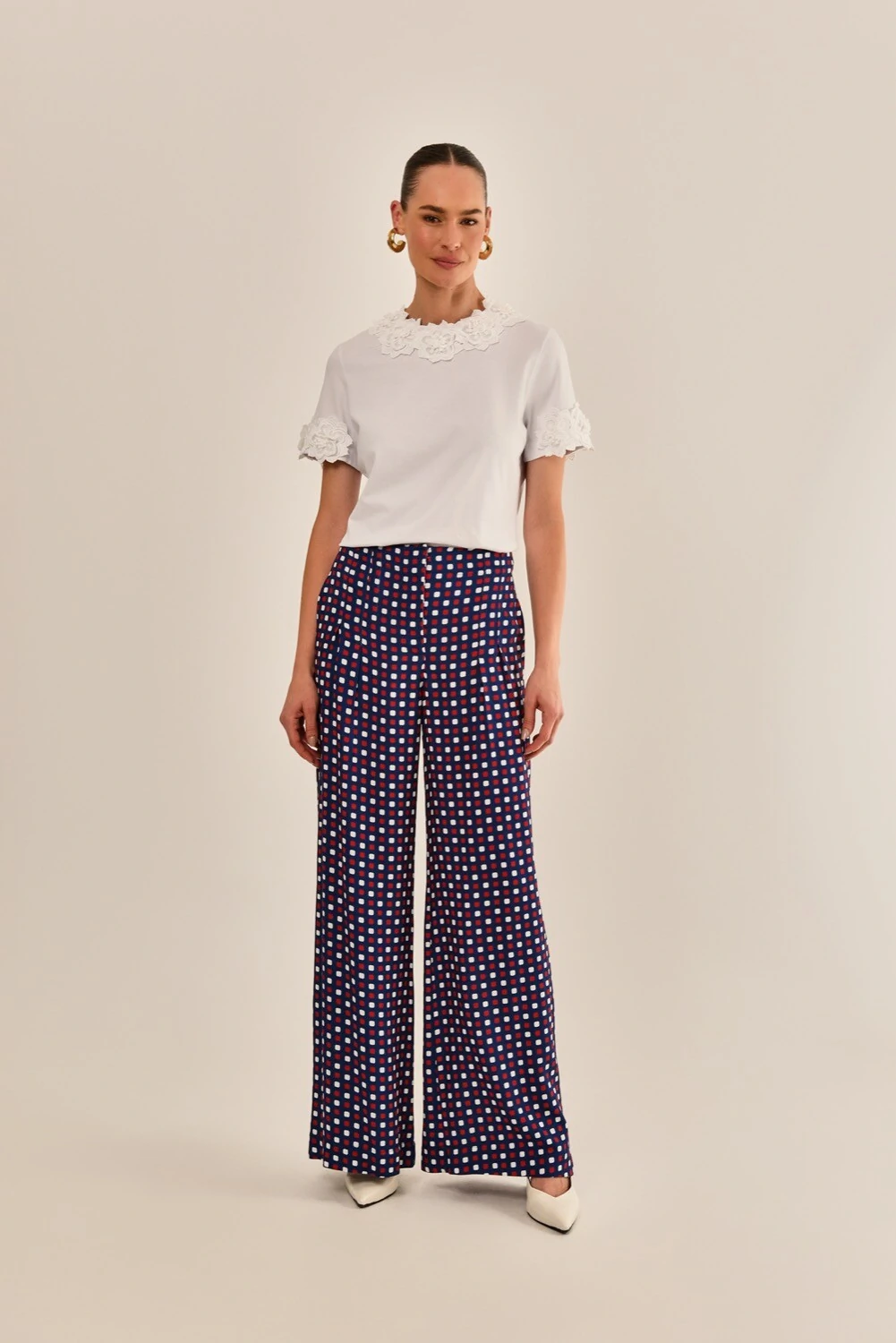 A calça Ada é feita em viscose com estampa autoral de gravataria em azul marinho e vermelho. Possui modelagem pantalona, cós aplicado em cintura média, bolsos posteriores e barra simples. Peça leve, fácil de compor e confortável.