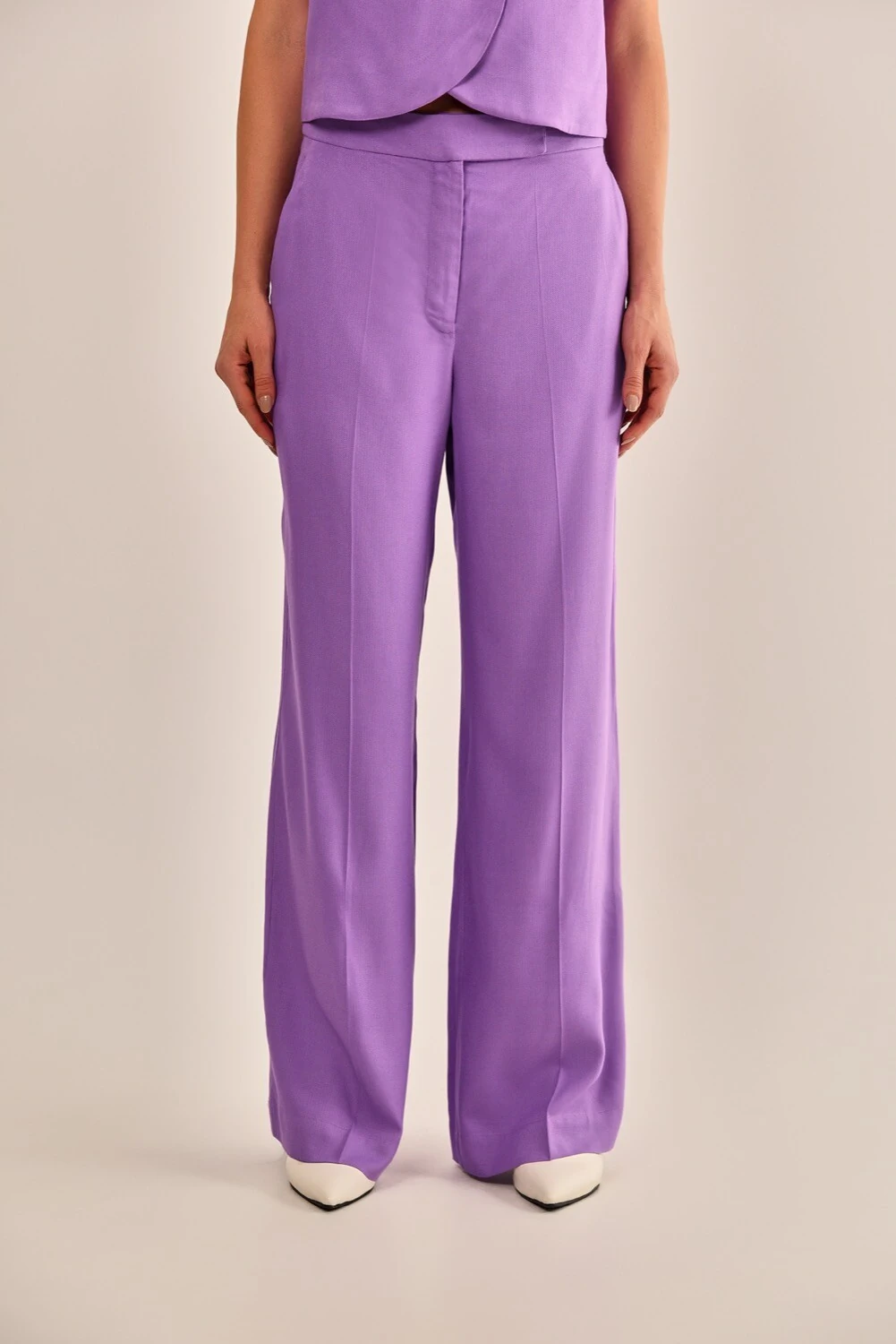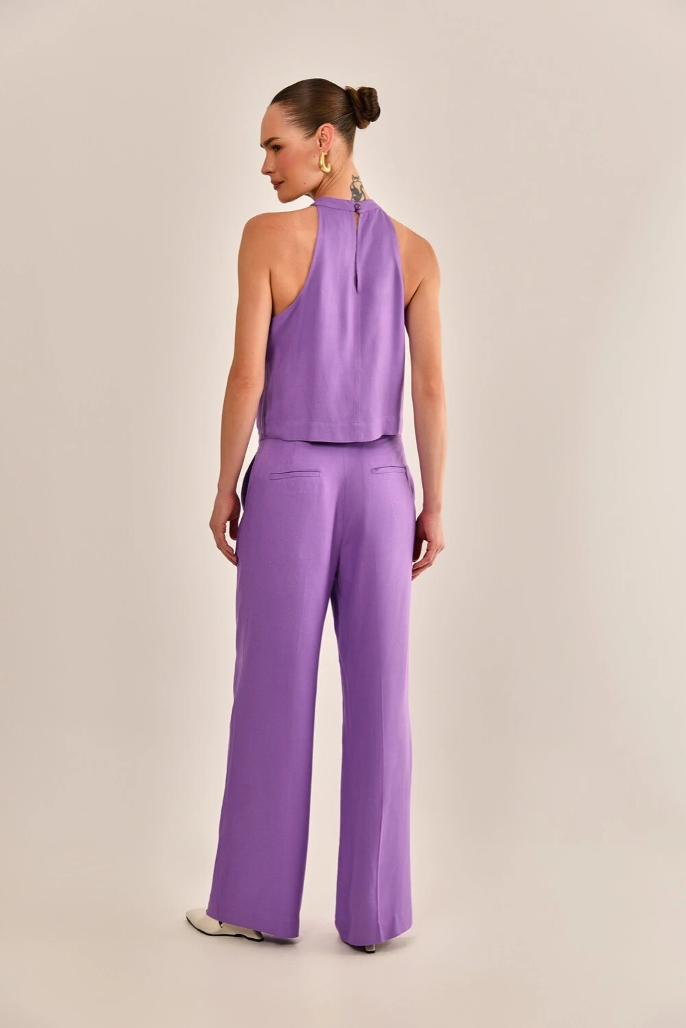 A calça Zion é confeccionada em viscose soft touch na cor lavanda. Possui modelagem wide leg, caimento elegante, cós aplicado, bolsos laterais e posteriores e barra simples. Peça desenvolvida com matéria-prima leve e respirável, ideal para os dias mais quentes.