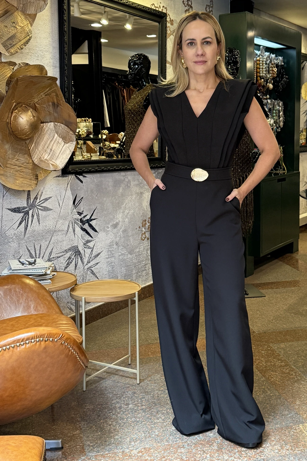 Macacão com babado estruturado, fechamento em 'ziper na parte posterior e acompanha cinto.