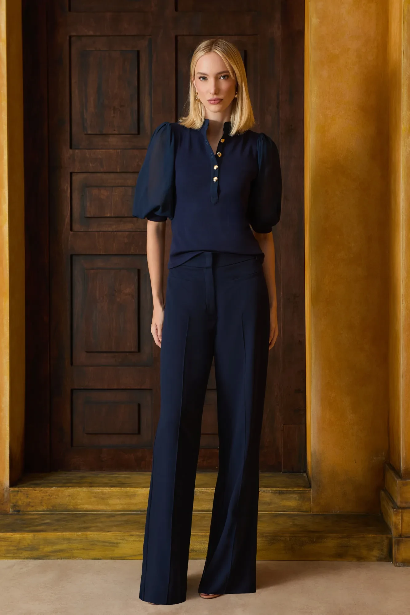 O volume da manga compensa o ajuste do corpo, resultando em uma silhueta contemporânea e interessante.