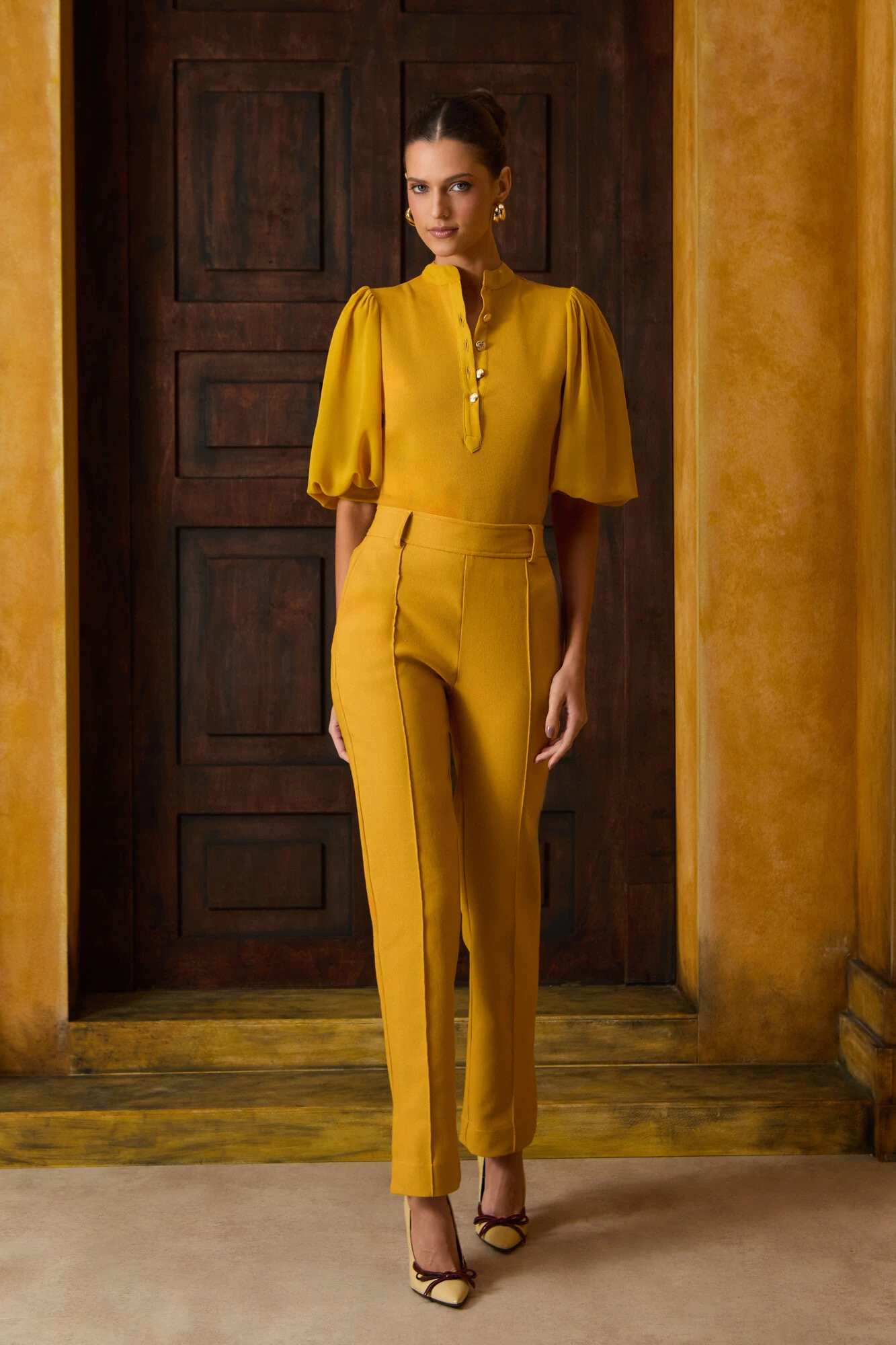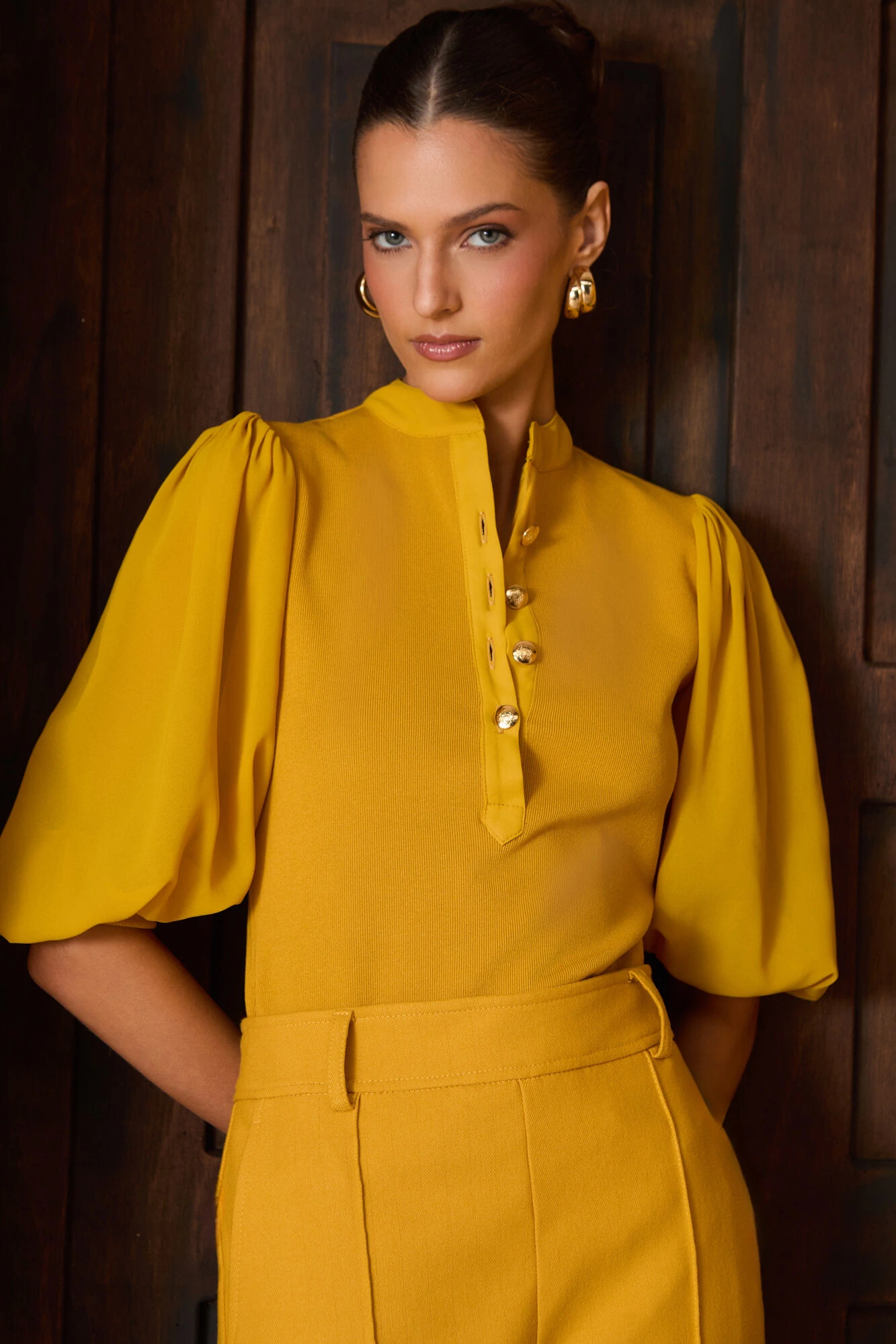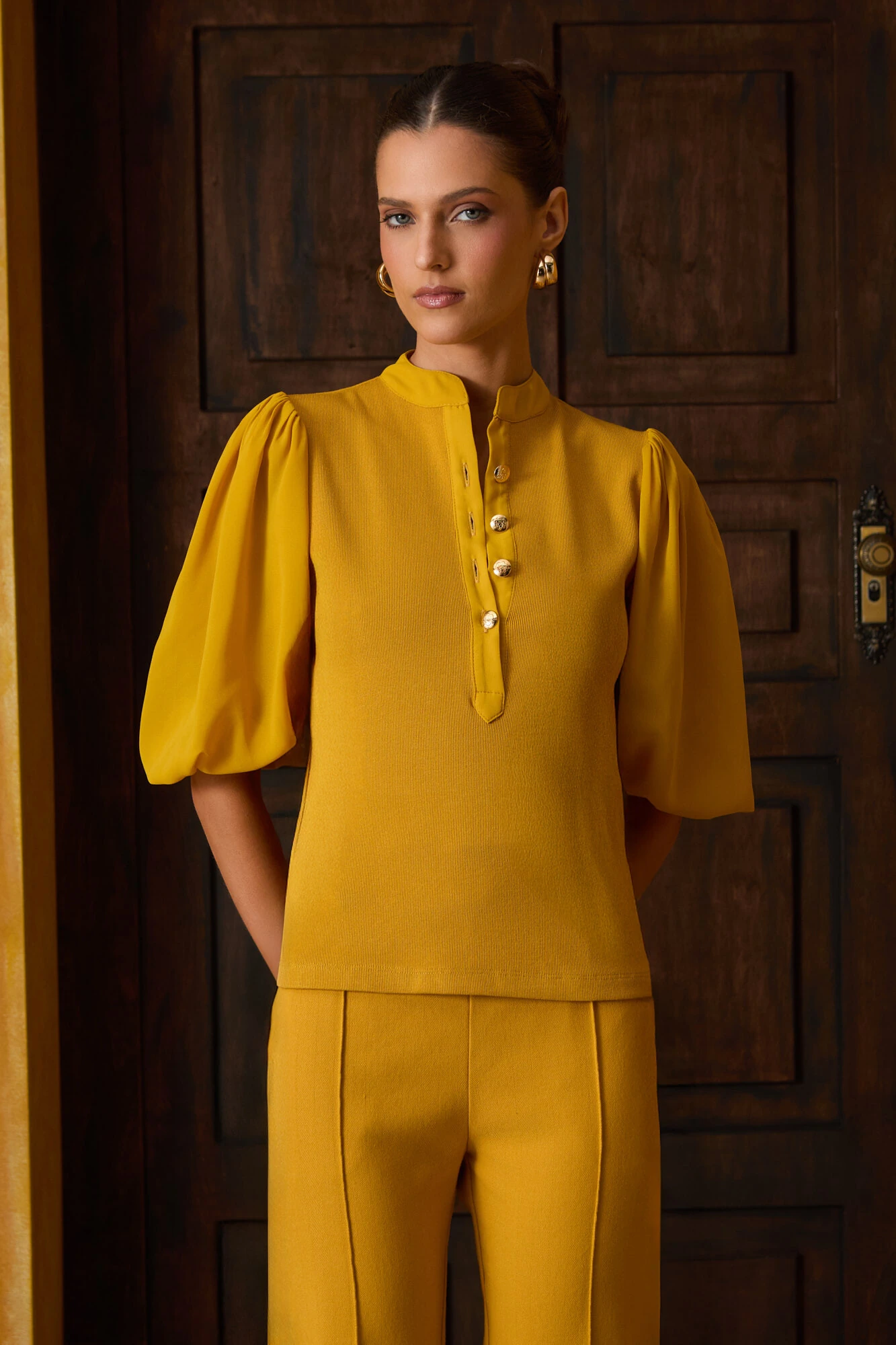 O volume da manga compensa o ajuste do corpo, resultando em uma silhueta contemporânea e interessante.