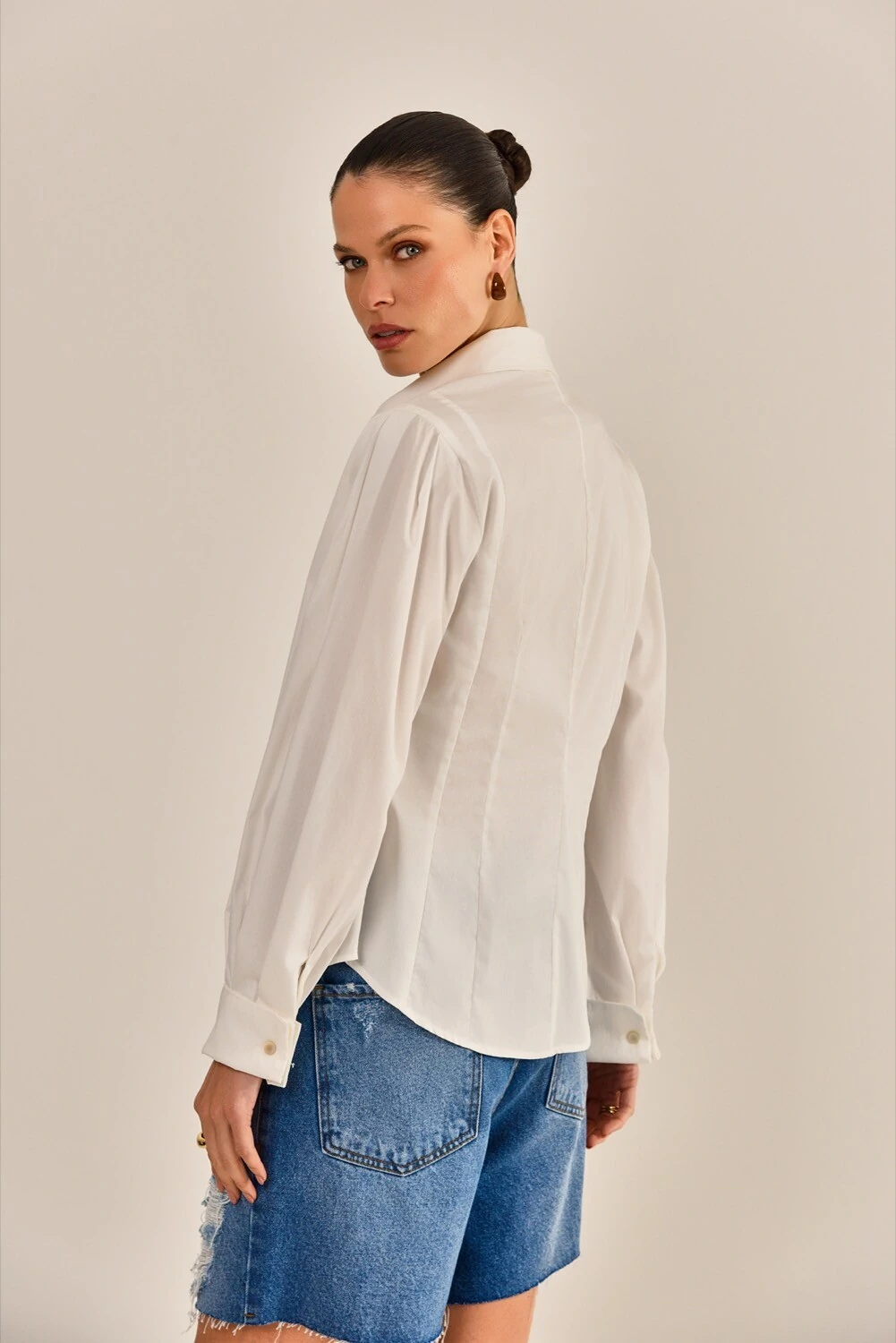 A camisa Alena é feita em tricoline, disponível na cor off white. Possui modelagem slim, mangas longas levemente bufantes. Os botões são forrados no mesmo tecido da camisa, com detalhe para o botão da gola, substituído por uma pérola. A peça perfeita para produções que vão do casual chic ao office look.
