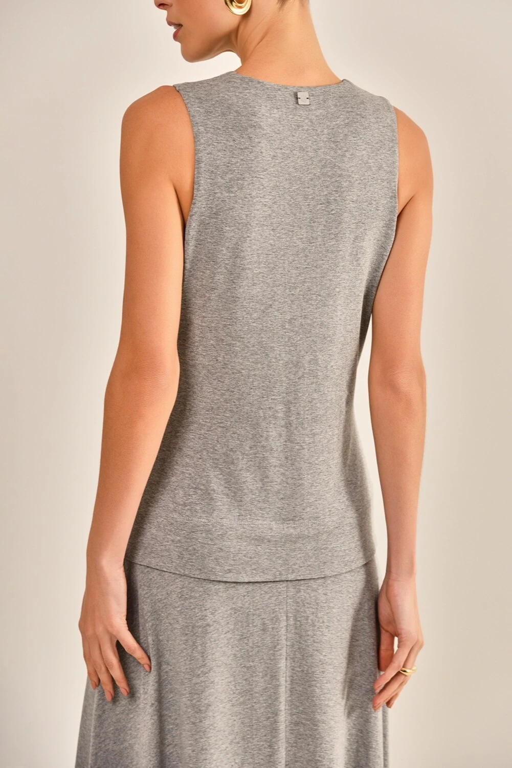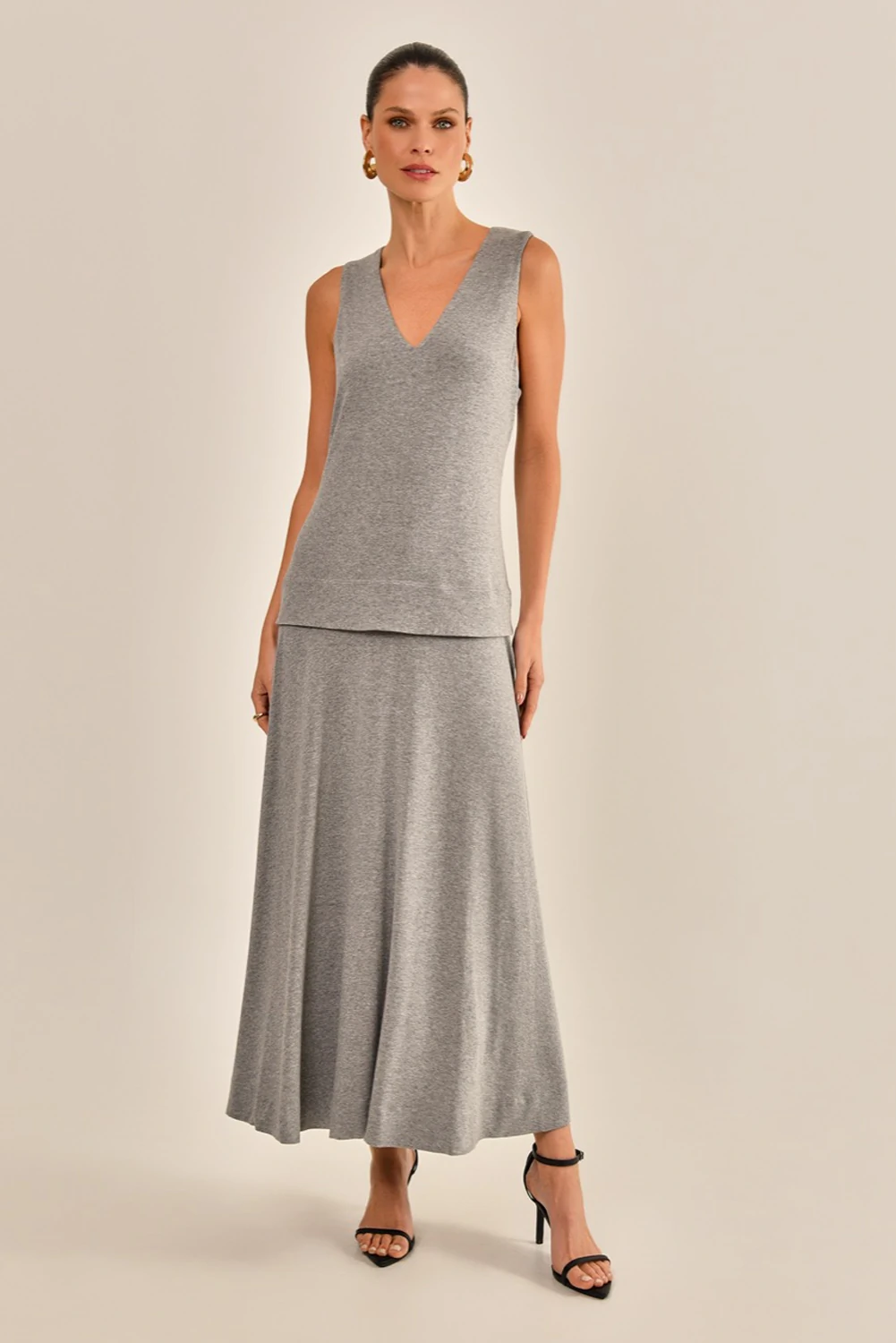 O vestido Alessandra é confeccionado em malha fluida na cor cinza mescla. A peça oferece caimento leve e confortável, valorizando a silhueta com naturalidade. Possui decote ¿v¿, regata simples e saia longa com movimento que adiciona sofisticação ao look.