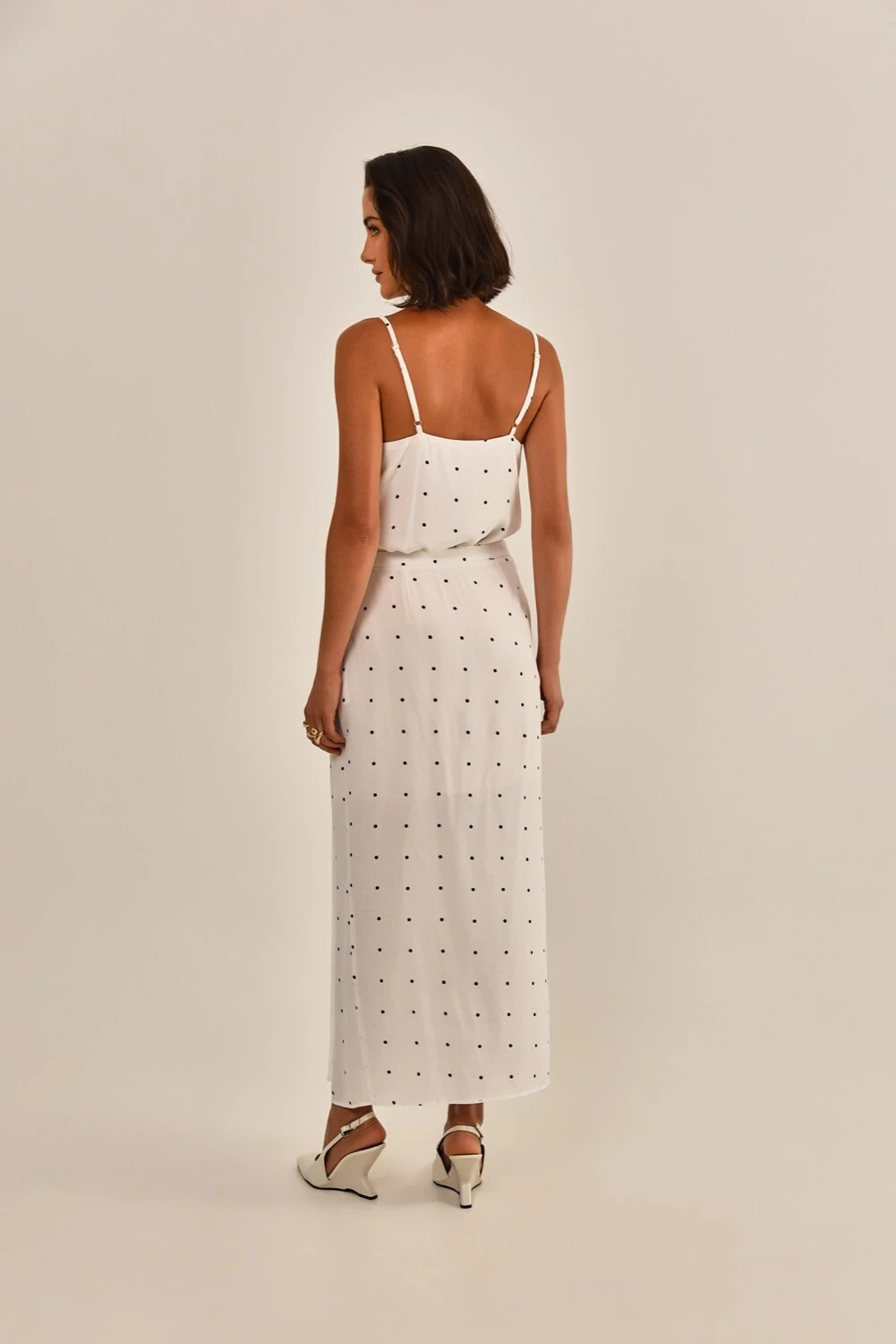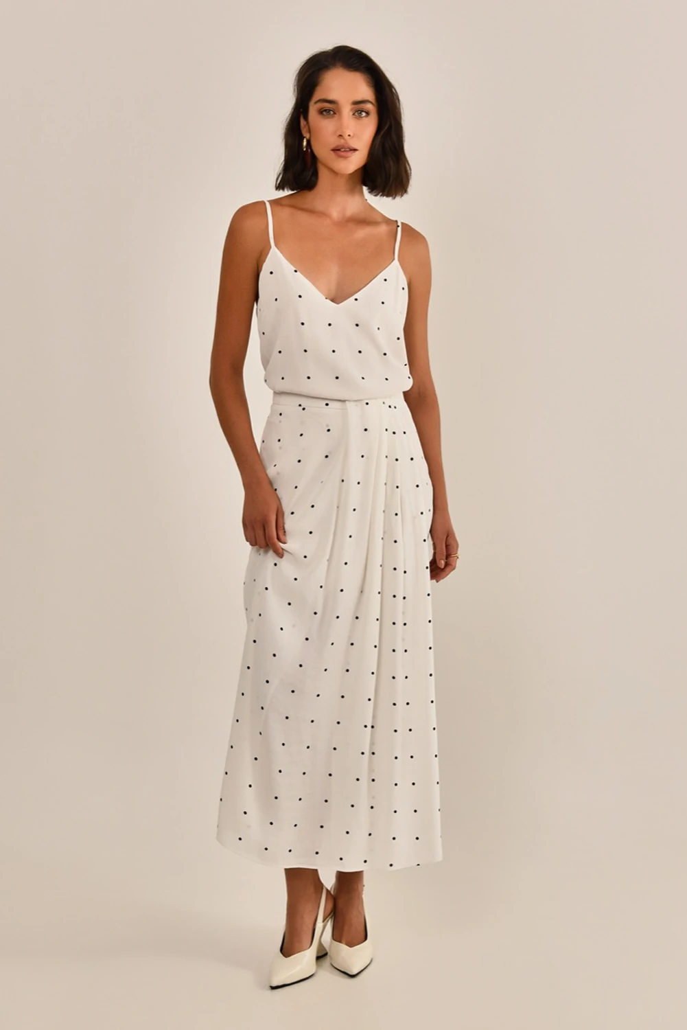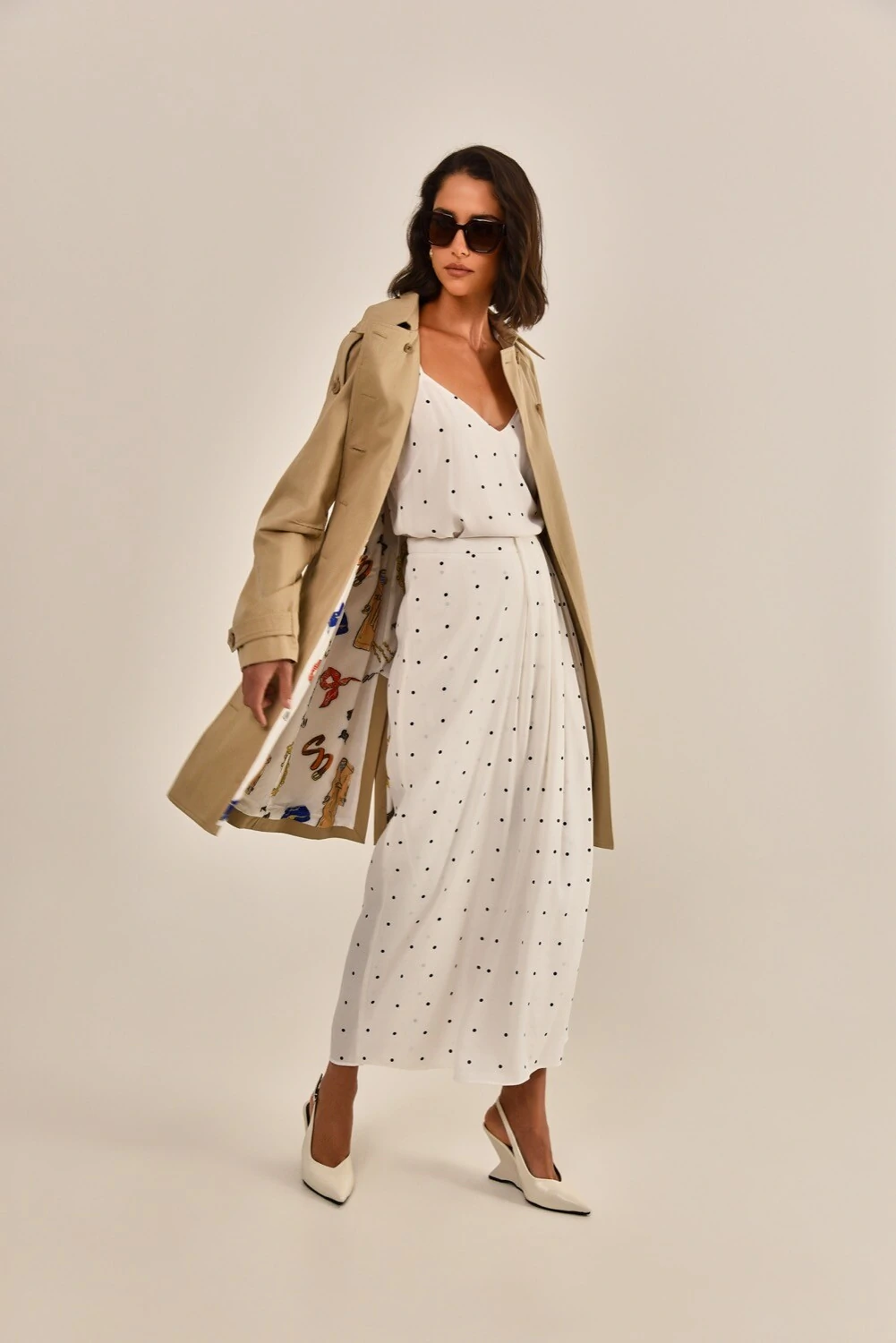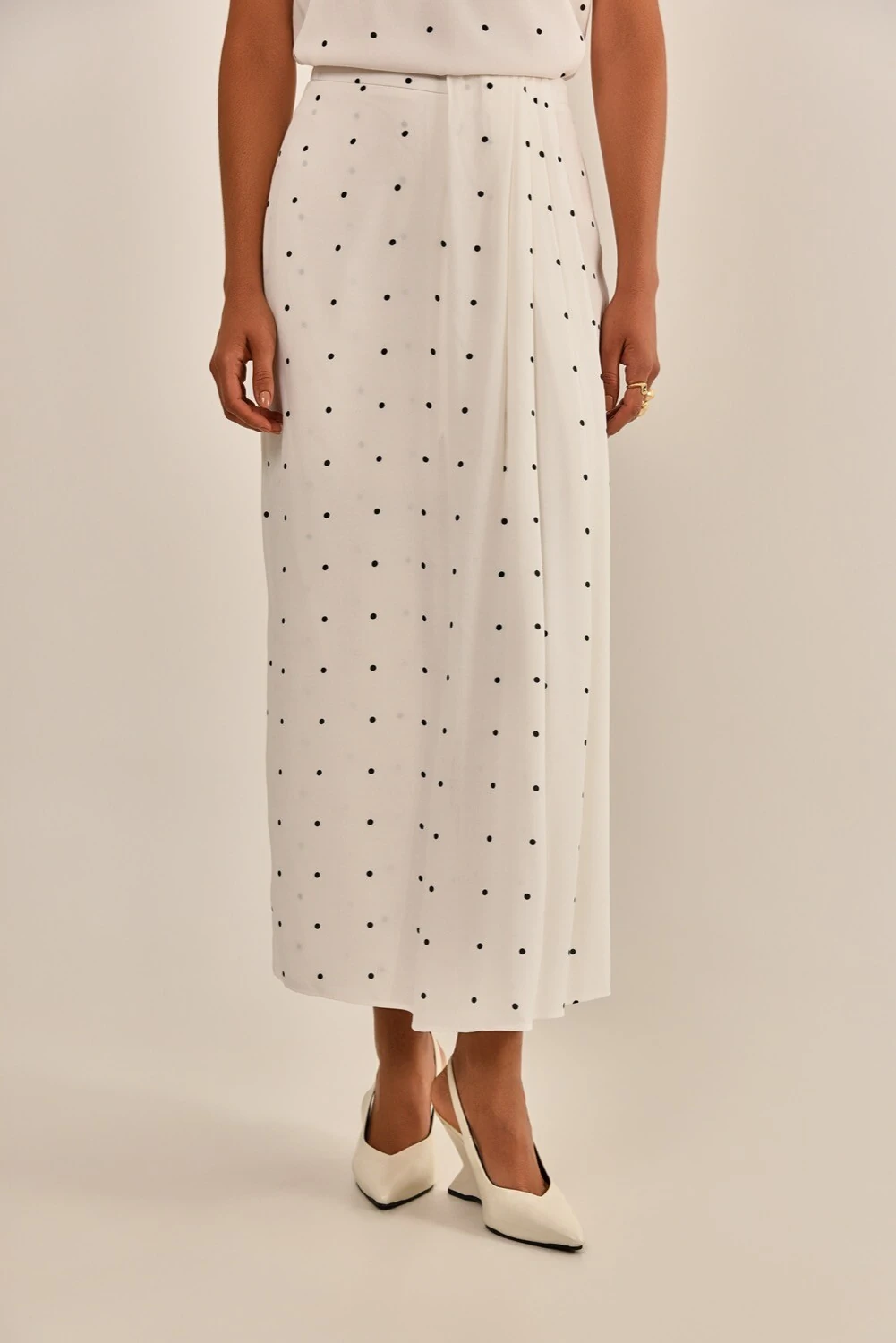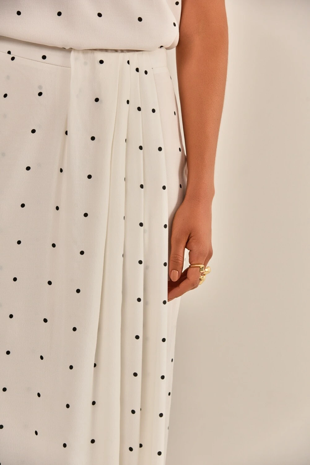 A saia Beatriz é confeccionada em crepe de viscose estampa poá, disponível na cor off white. Possui modelagem reta, comprimento midi, drapeado lateral e acabamento simples. O detalhe fica por conta das pregas aplicadas na lateral do cós, trazendo um movimento delicado à peça.