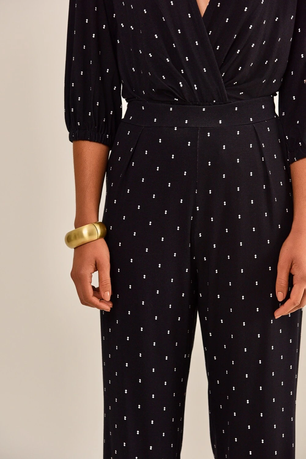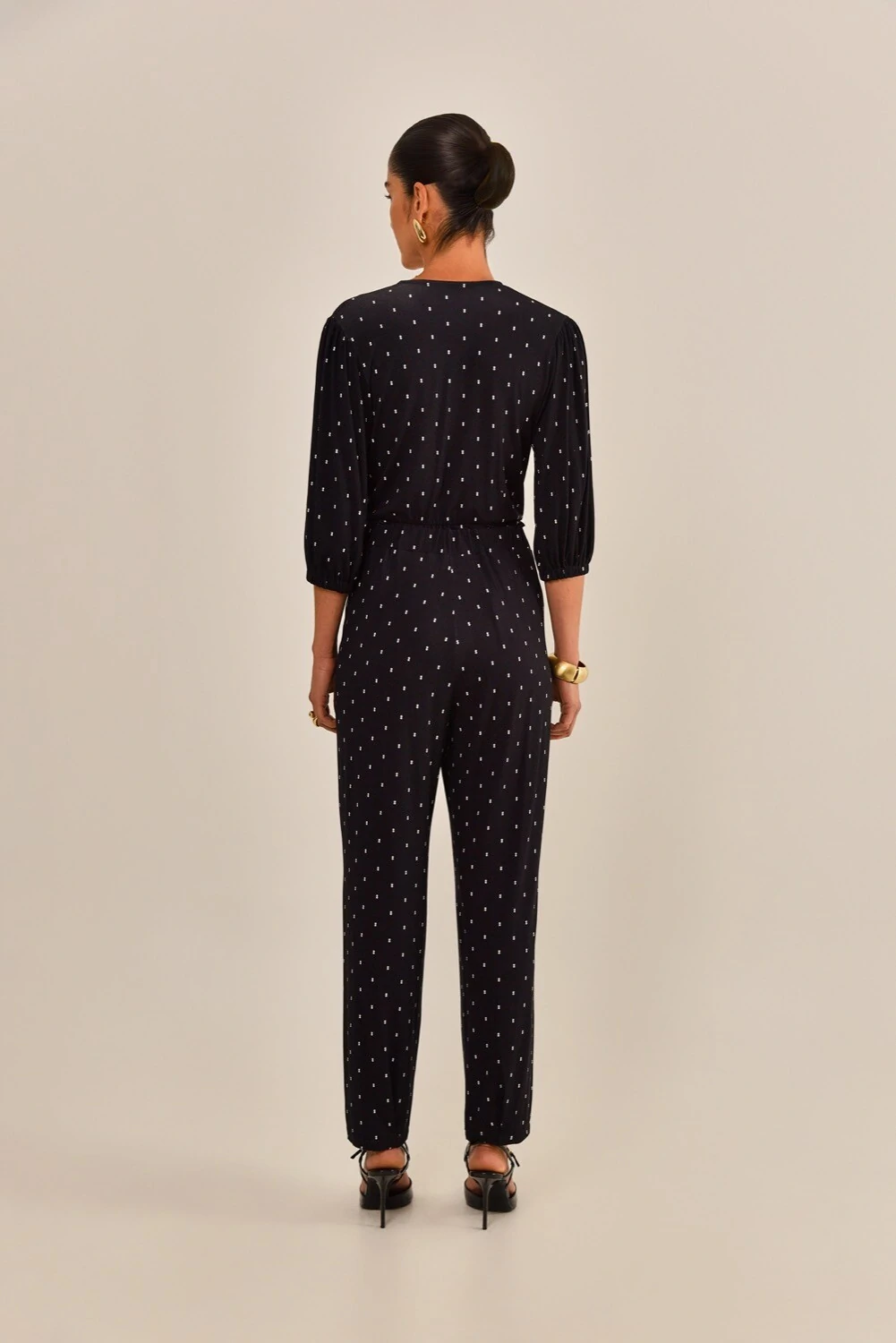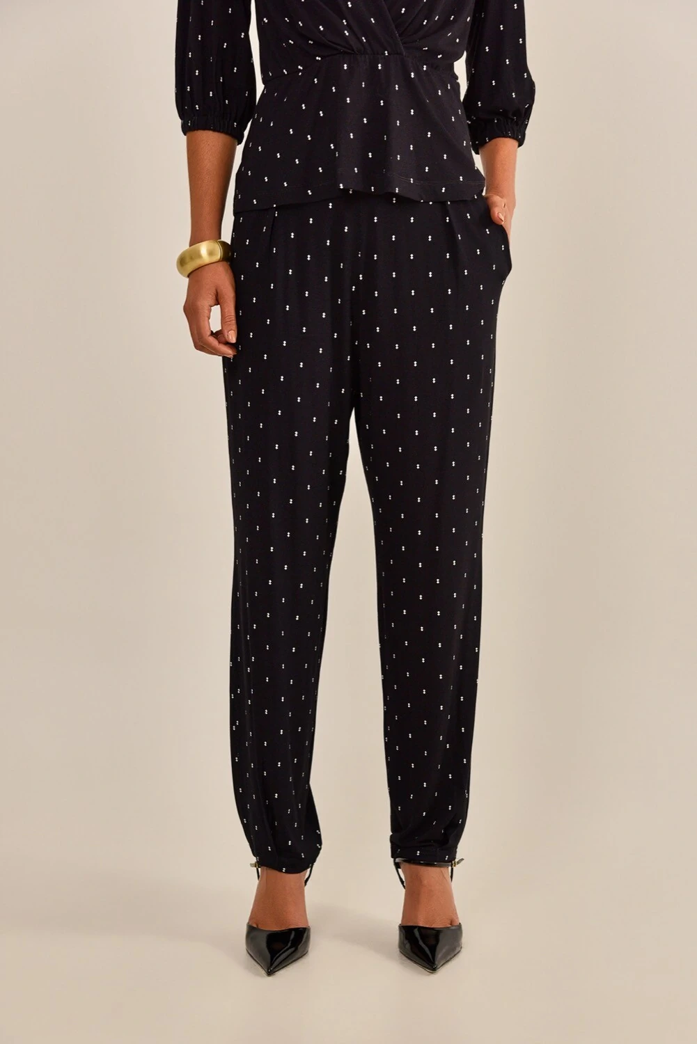 A calça Bia é feita em malha de viscose na cor preto, com estampa geométrica mini na cor off white. Possui modelagem carrot, cós aplicado em cintura média, bolsos laterais e barra ajustada. Peça leve, fácil de compor e confortável.
