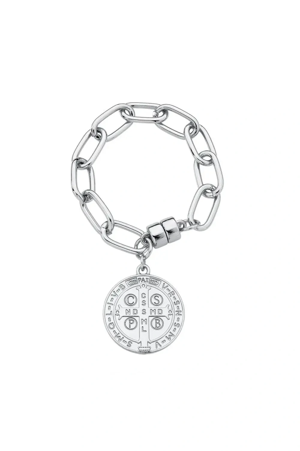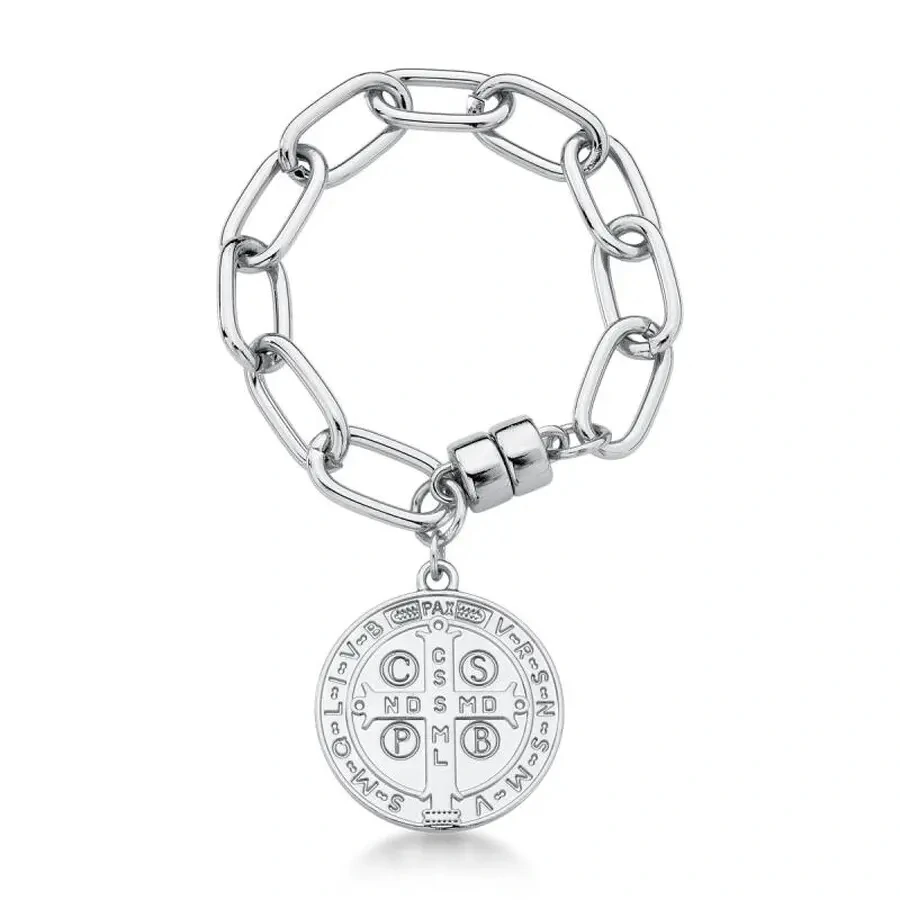 Pulseira em elos metálicos com banho de rodio com pingente da medalha do São Bento. Fechamento prático em ímã.