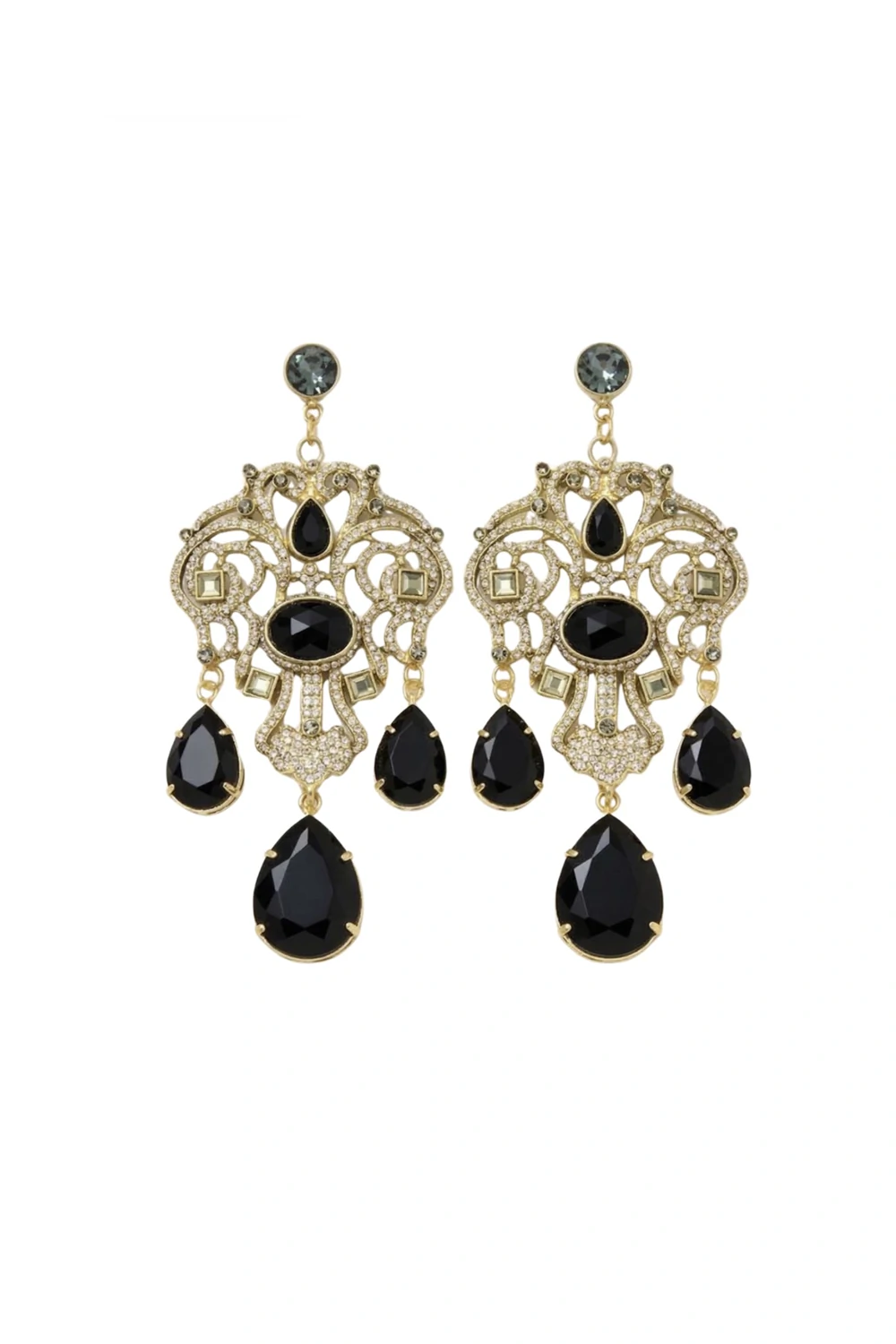 Maxi Brinco confeccionado em metal com banho ouro vintage, todo cravejado em cristais black diamond e gotas em resina preta. Fechamento em pino e tarraxa