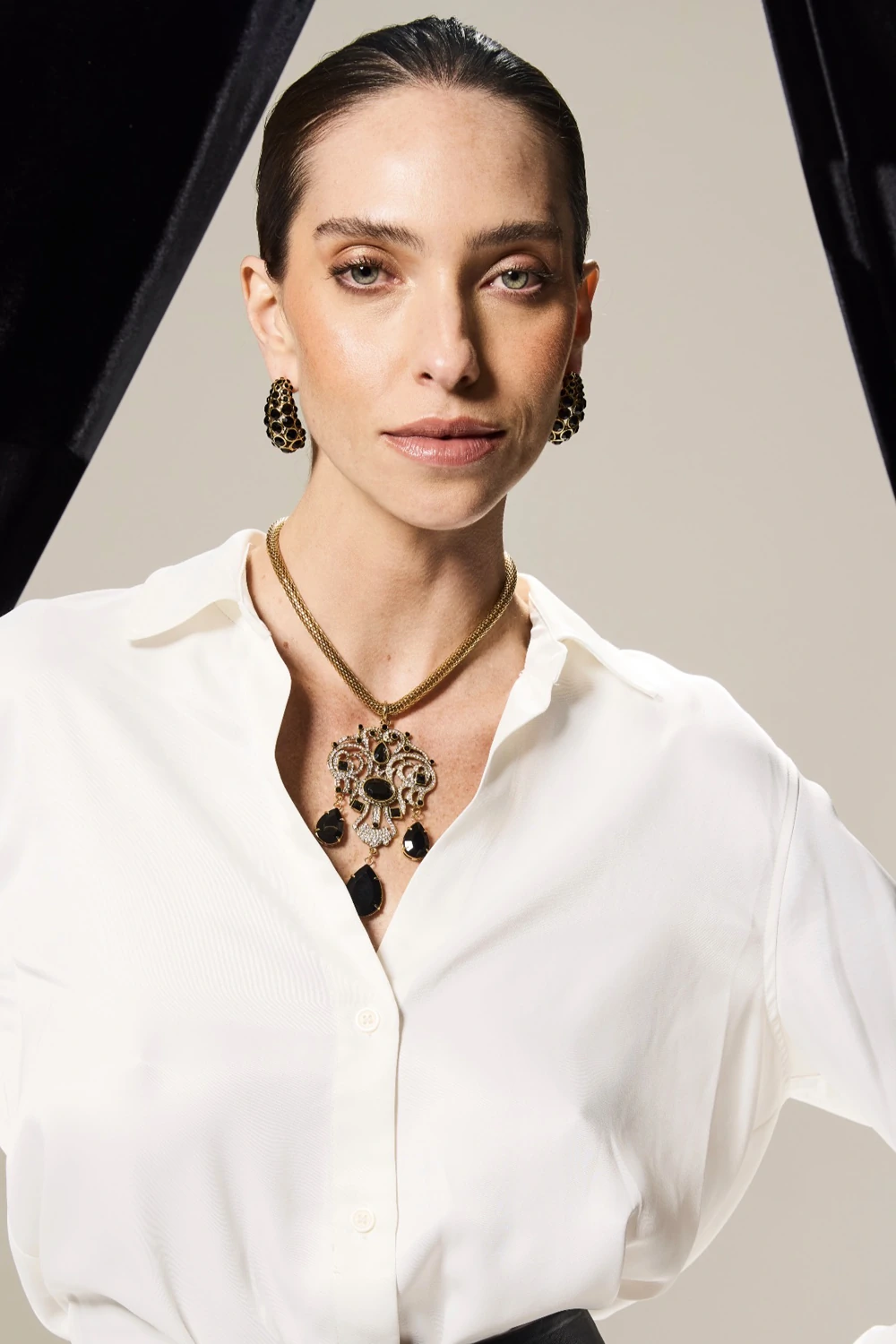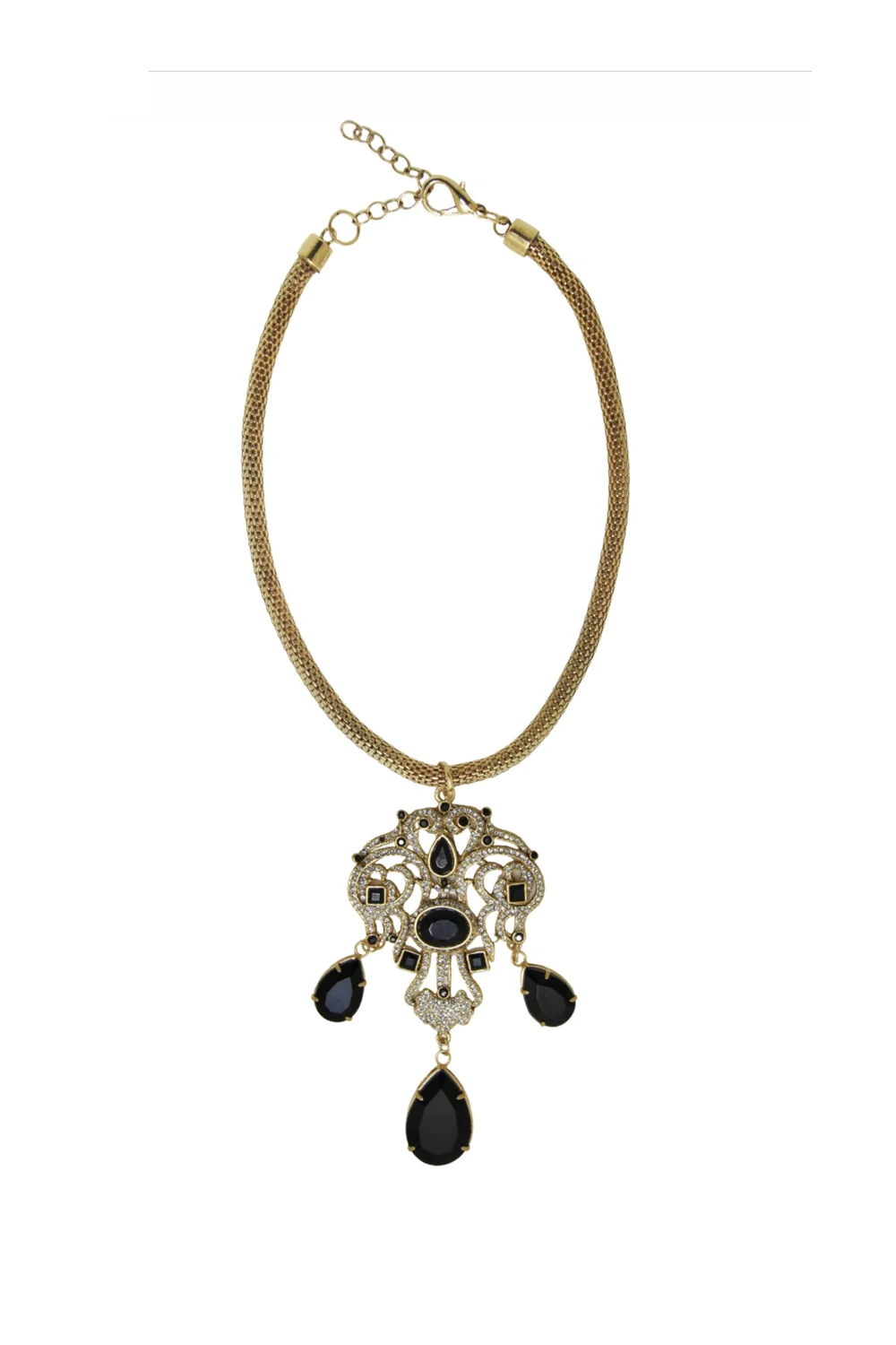 Colar confeccionado em metal com banho ouro vintage, todo cravejado em cristais black diamond e gotas em resina preta. Fechamento em fecho lagosta e corrente