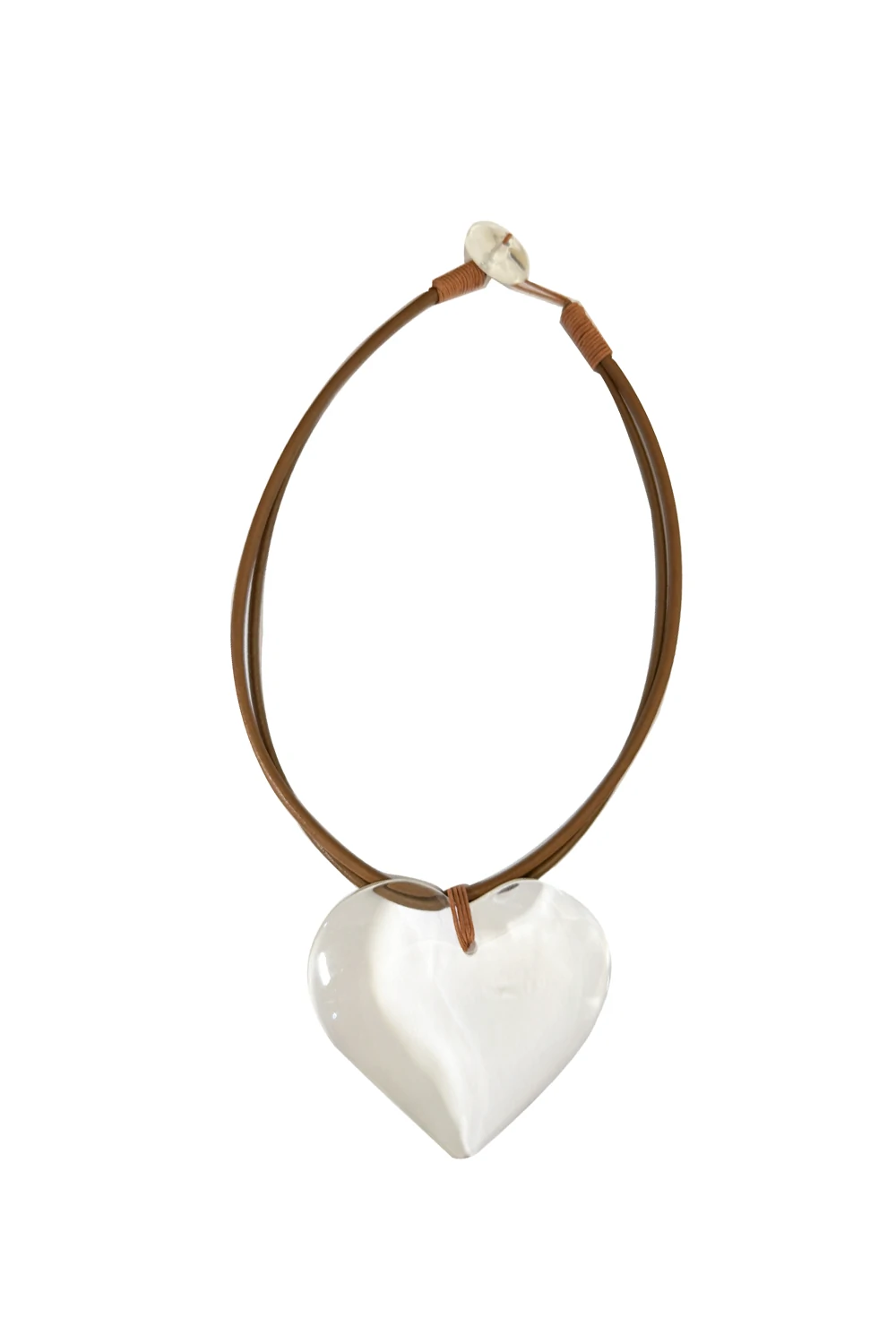 Colar curto em couro caramelo com pingente grande de resina transparente em formato de coração. Fechamento em argola de couro e botão de resina