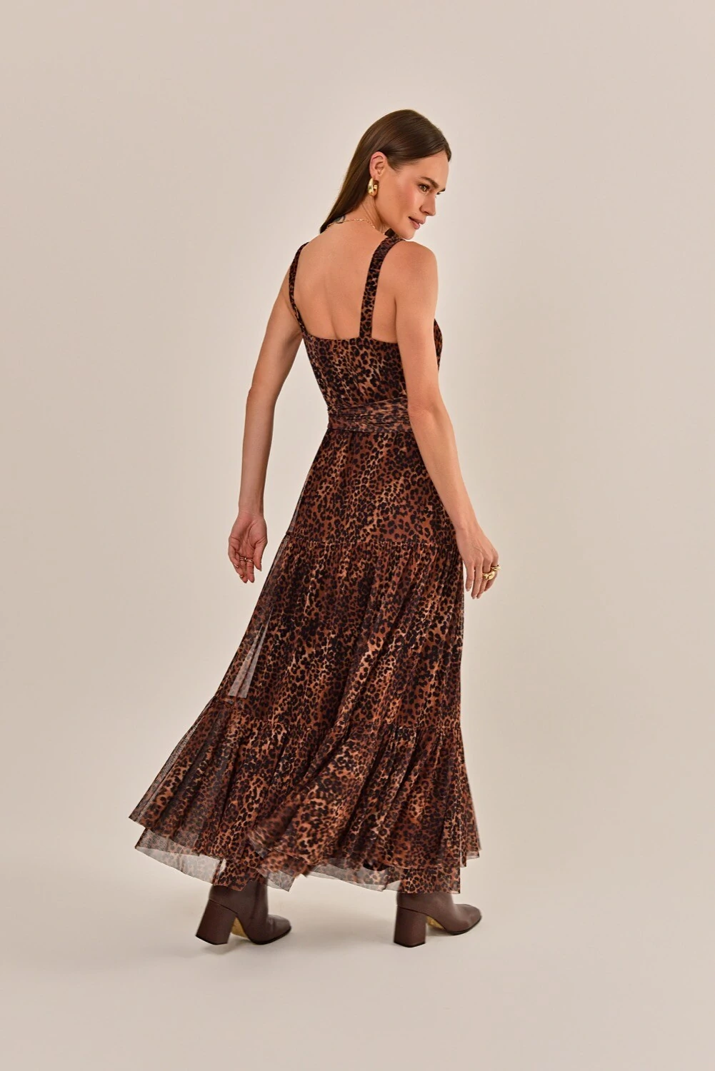O vestido Céu é feito em tule marrom com estampa animal print. Possui modelagem evasê e comprimento longo, unindo sensualidade e modernidade. Com decote redondo, regata com alças médias, saia em camadas com caimento fluido, forro aplicado e barra simples. O vestido acompanha faixa em mesmo tecido para ajuste de cintura.