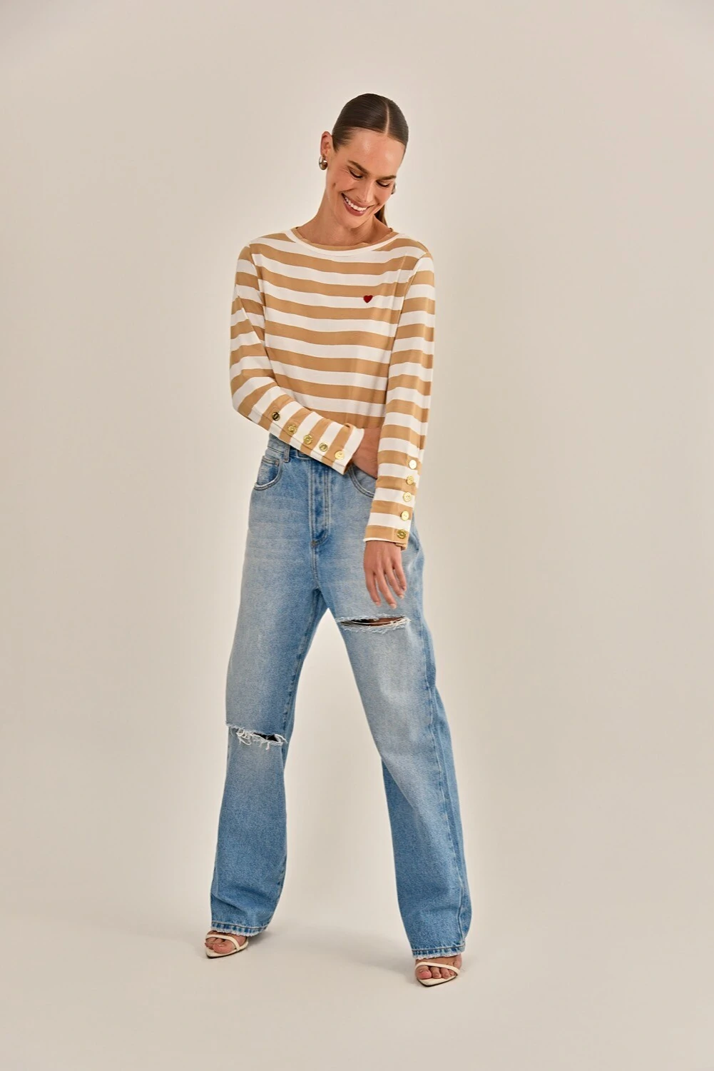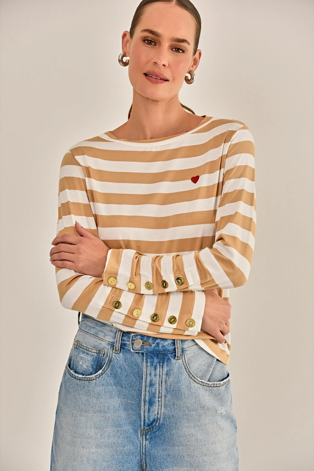 A camiseta Ahahi é feita em malha listrada, disponível na cor off white com listras em azu ou caquil. Possui modelagem slim, mangas longa, decote redondo, botões aplicados nos punhos e acabamento simples. Detalhe aplicado em bordado manual de coração vermelho. Peça básica e confortável, essencial para o seu closet.