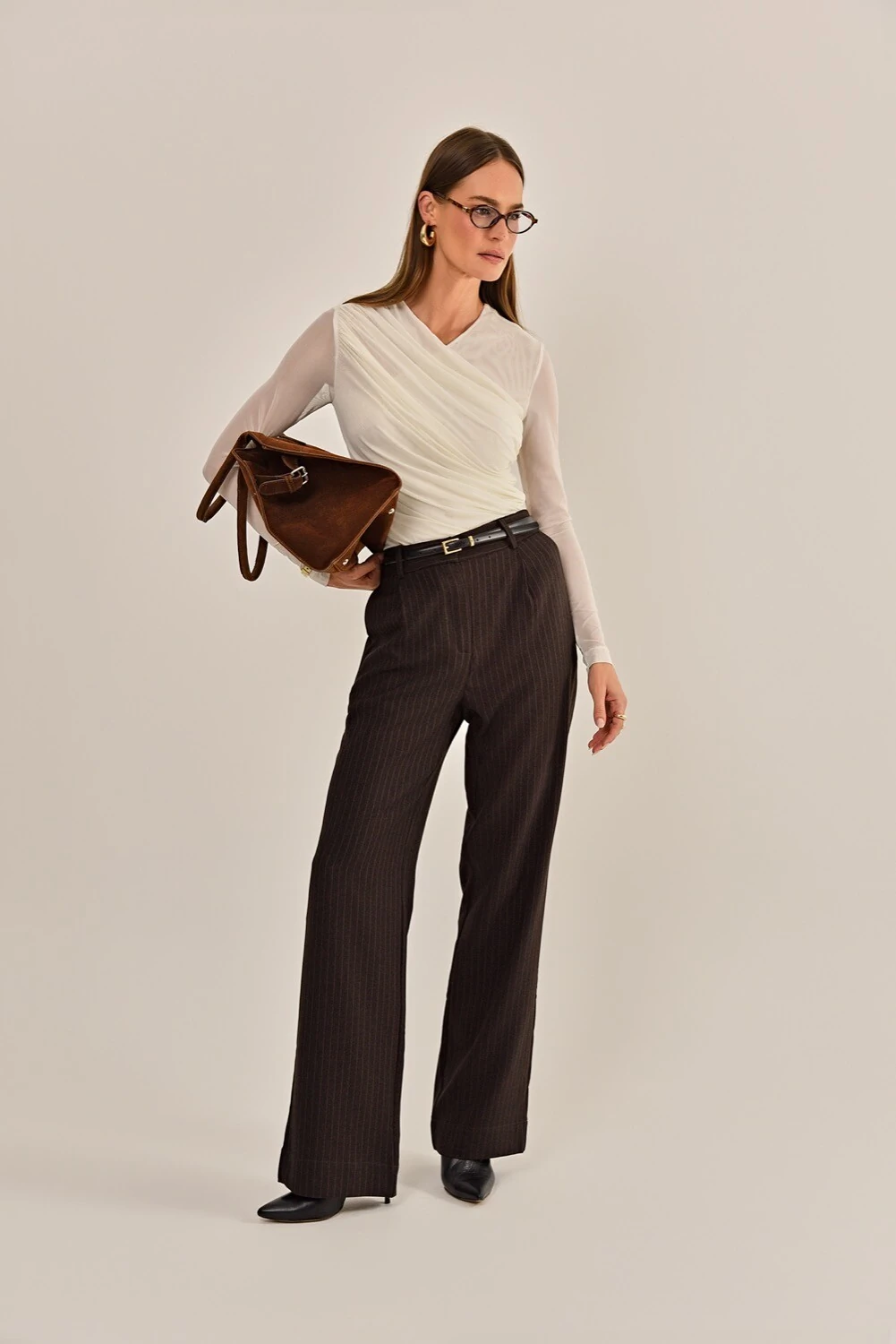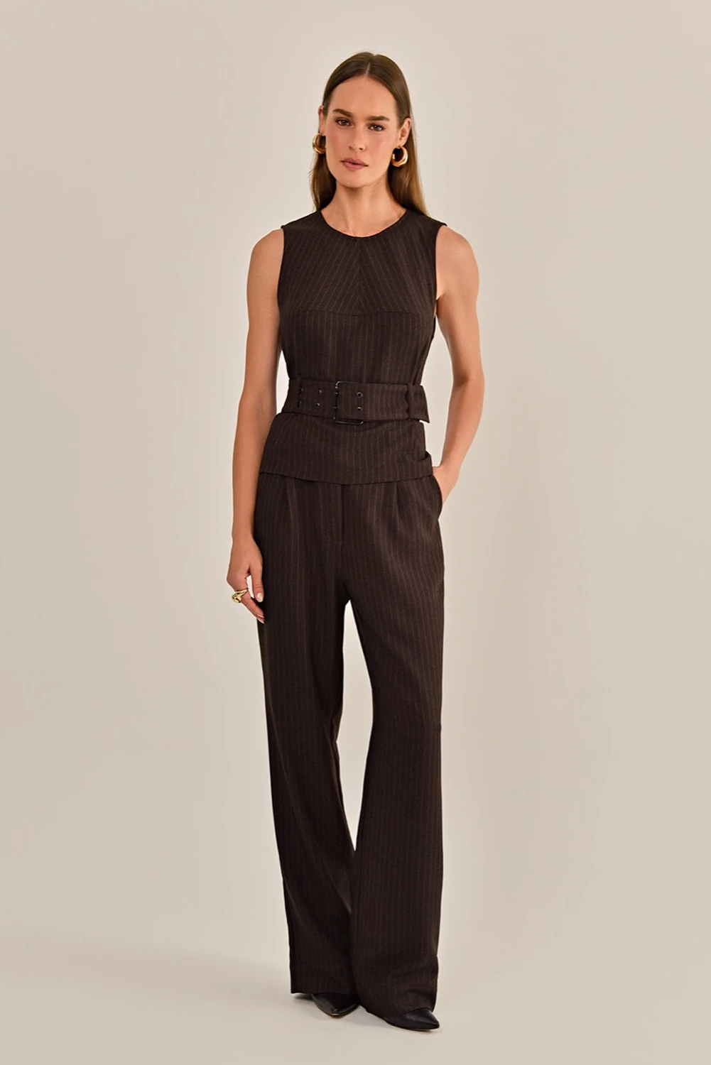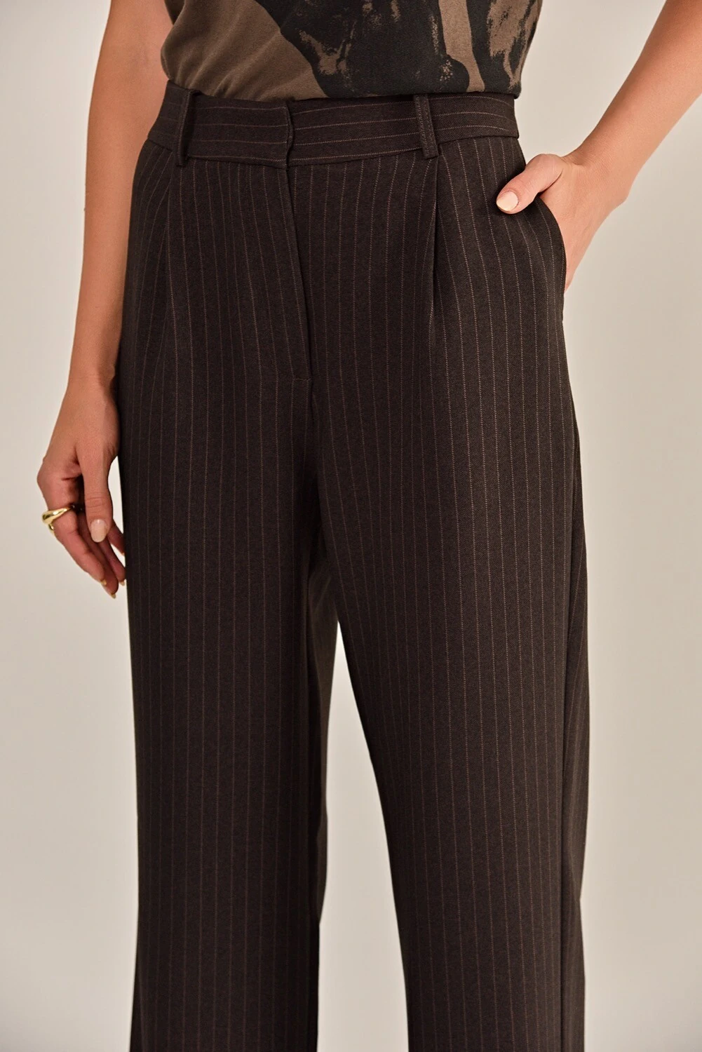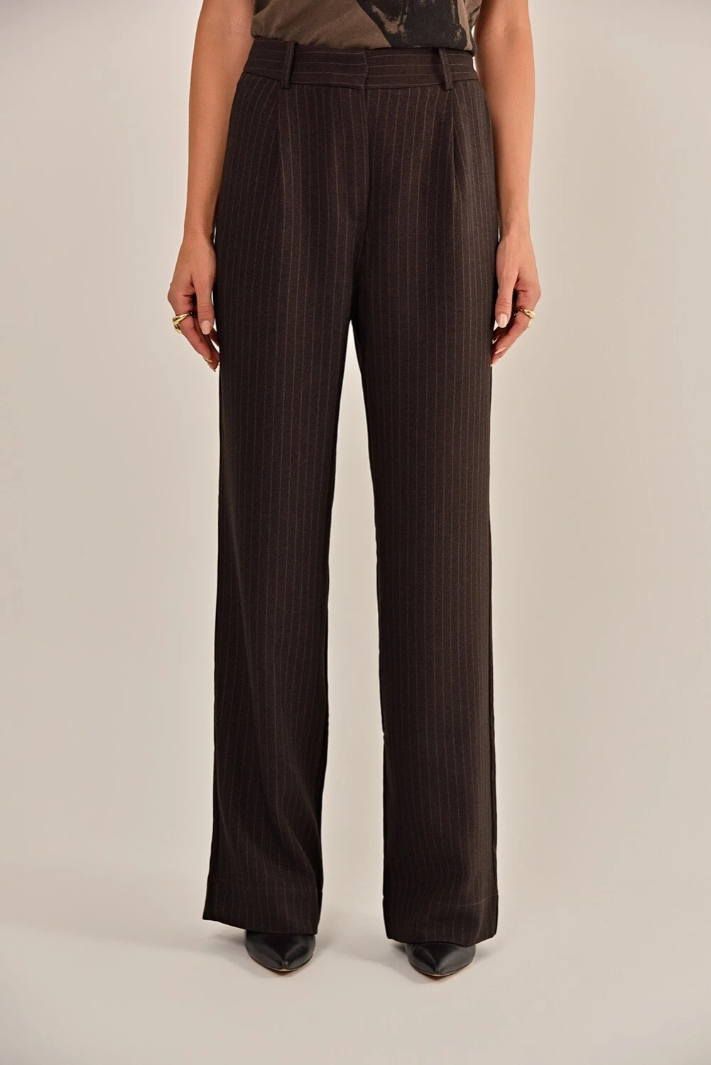 A calça Blues é feita em alfaiataria risca de giz, disponível na cor marrom. Possui modelagem reta, cintura alta, cós aplicado com passantes e acabamento de alfaiataria que reforçam o design atemporal. Peça elegante e clássica para uma produção sem esforço.