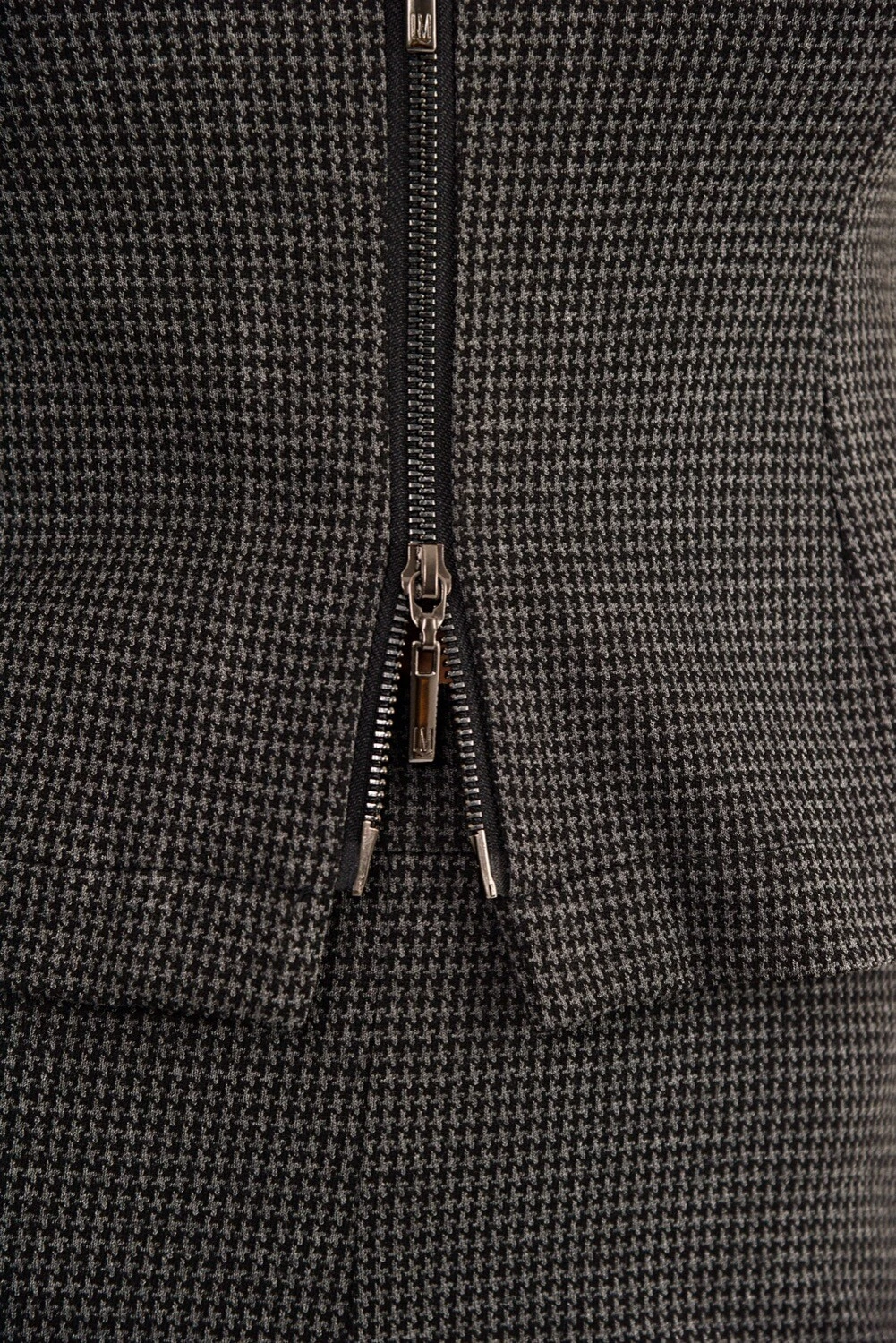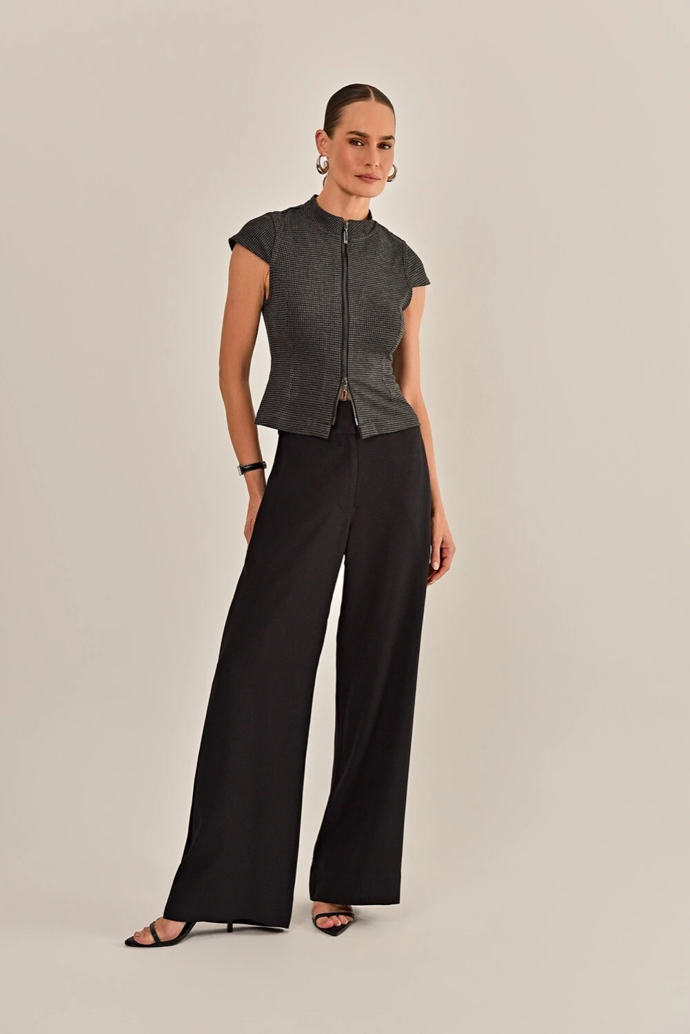 A blusa Bordeaux é feita em malha de viscose, disponível na cor cinza com padronagem pied de poule. Possui modelagem slim, mangas curtas, decote v, abertura frontal por zíper e acabamento simples. A peça agrega sofisticação em uma proposta atemporal, que resulta na elegância do clássico com personalidade.