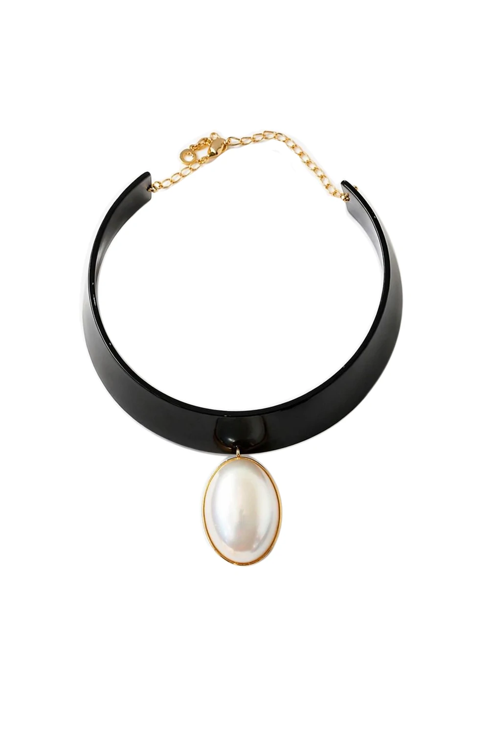 Choker fabricado em metal com esmaltação na cor preta e pingente oval em pérola sintética com borda em metal com com banho de ouro. Fechamento em corrente e fecho lagosta